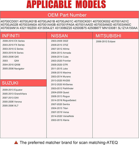 【Fitment】: This TPMS sensor fits INFINTI, NISSAN and SUZUKI vehicles. Please scroll down to product description for complete list of model and year.