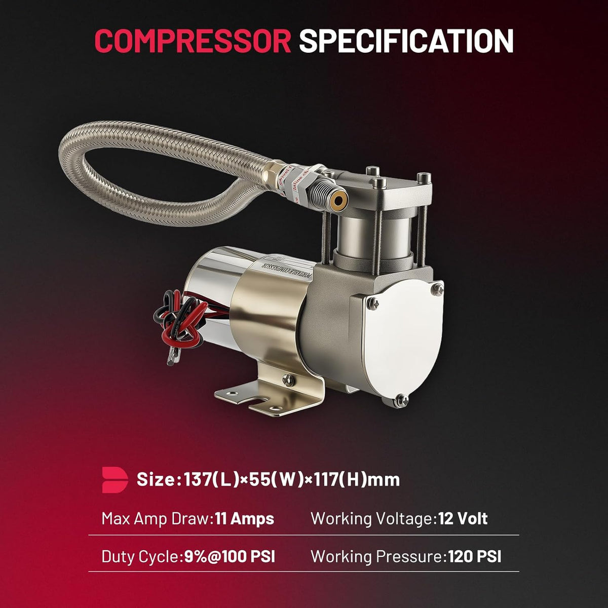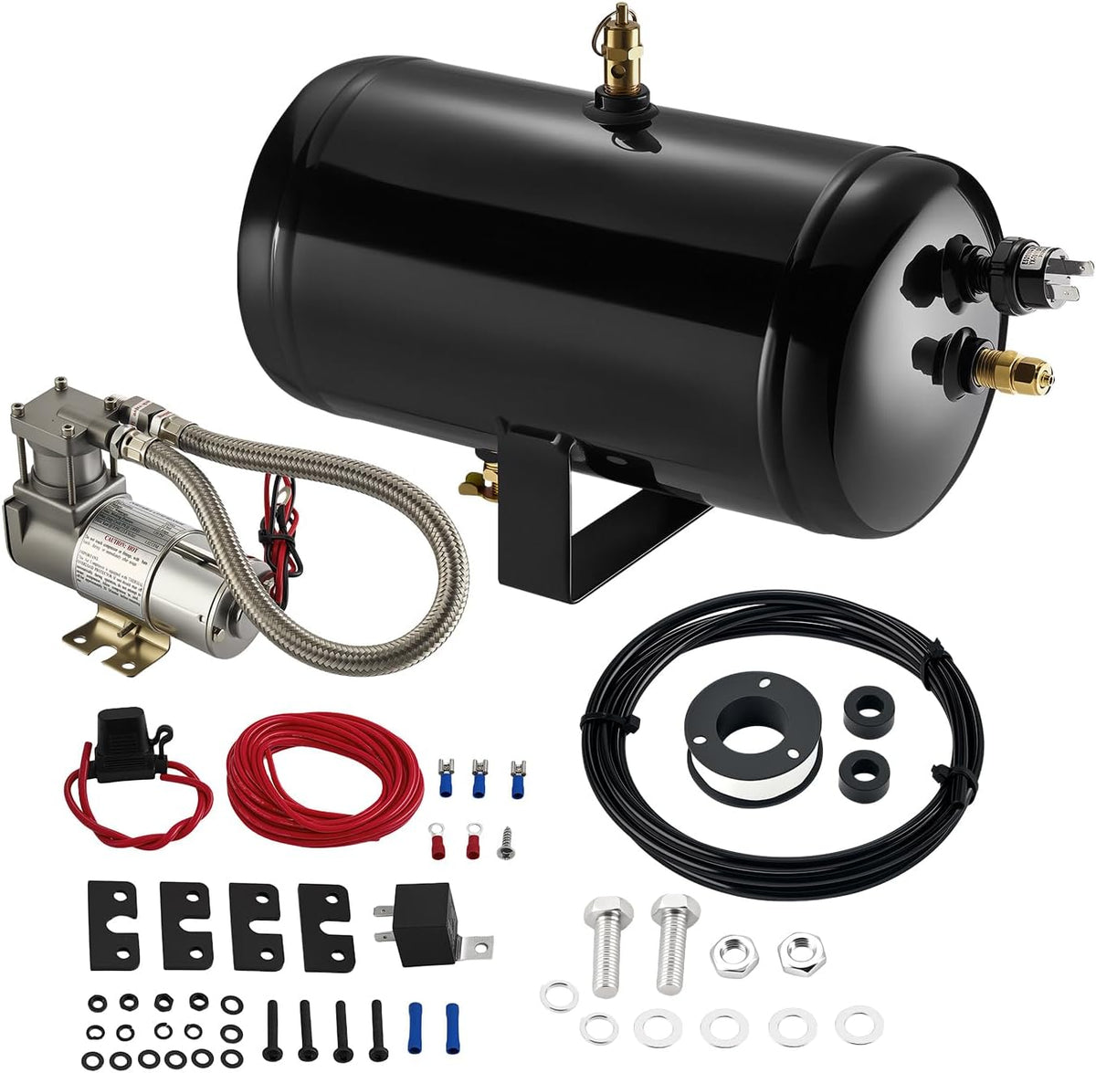【Product Includes】: ① 1x Compressor with Metal Braided Tube and Check Valve NPT1/4 ; ② 1x 1.0Gal Air Tank (5 ports * NPT 1/4) ; ③ 1x Drain Valve NPT1/4 ; ④ 1x 145psi Safety Valve NPT1/4 ; ⑤ 1x Air Outlet Nozzle (NPT 1/4 - 6MM) ; ⑥ 1x High - Pressure Nylon Tube (2m - 6MM) ; ⑦ 1x Pressure Switch (70 - 100psi, NPT 1/4) ; ⑧ 2x Sets of Bolts ; ⑨ 1x Teflon Tape ; ⑩ 1x 40A 12V Relay ; ⑪ 1x 30A Fuse ; ⑫ 4x Sets of Bolts ; ⑬ 1x 5m Wire ; ⑭ 6x Cold - Pressed Terminals ; ⑮ 2x Rubber Gaskets