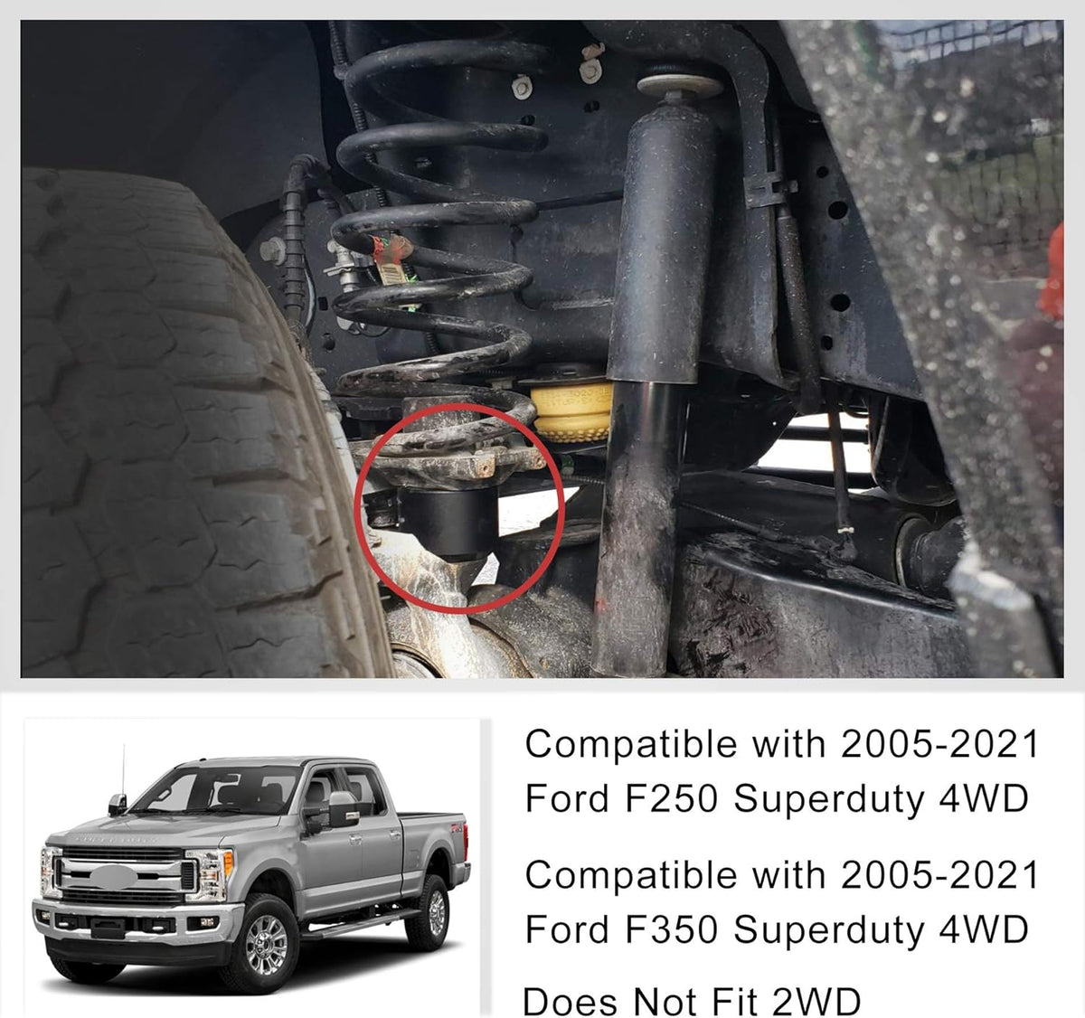 Model: leveling kit compatible with 2005-2021 F250/F350 Superduty 4WD, does not fit 2WD.