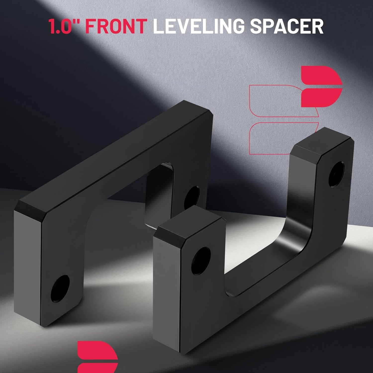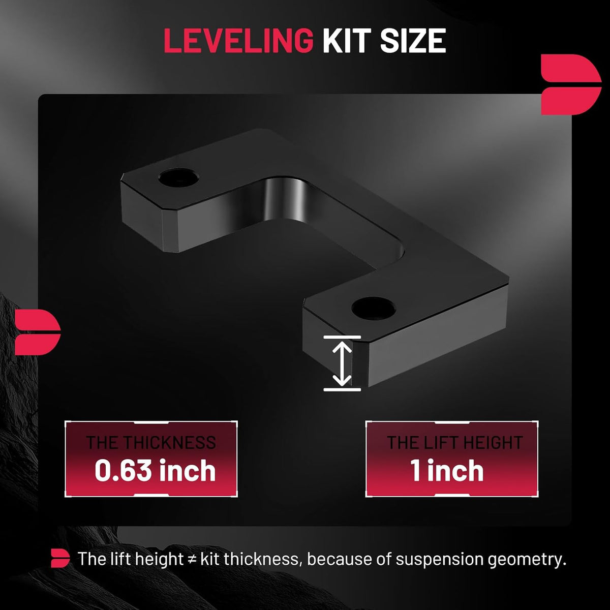 【NOTE】1 inch Front Leveling Kit, Please note that spacer thickness to lift height, Lift Spacer Thickness and Lift is not 1:1 Ratio.