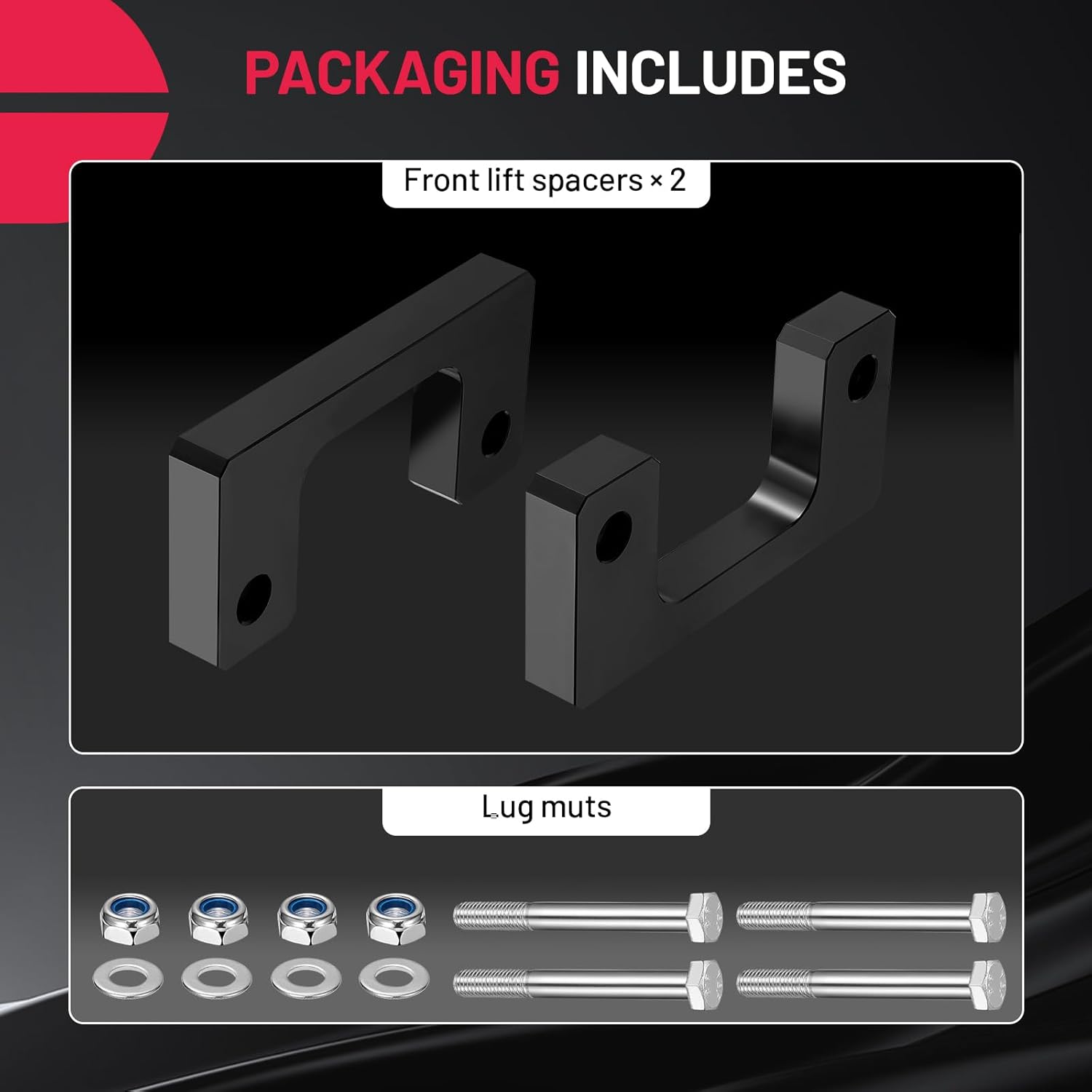 【Product Use】Generally, the car is not completely flat when driving on the road. Front lift kits are to raise the factory rake of your vehicle, make the front and rear of the car level. Increase the distance between the frame and the ground, make the vehicle look more perfect and cool. But it will never lessen your comfort level, making you more relaxed and enjoyable driving.