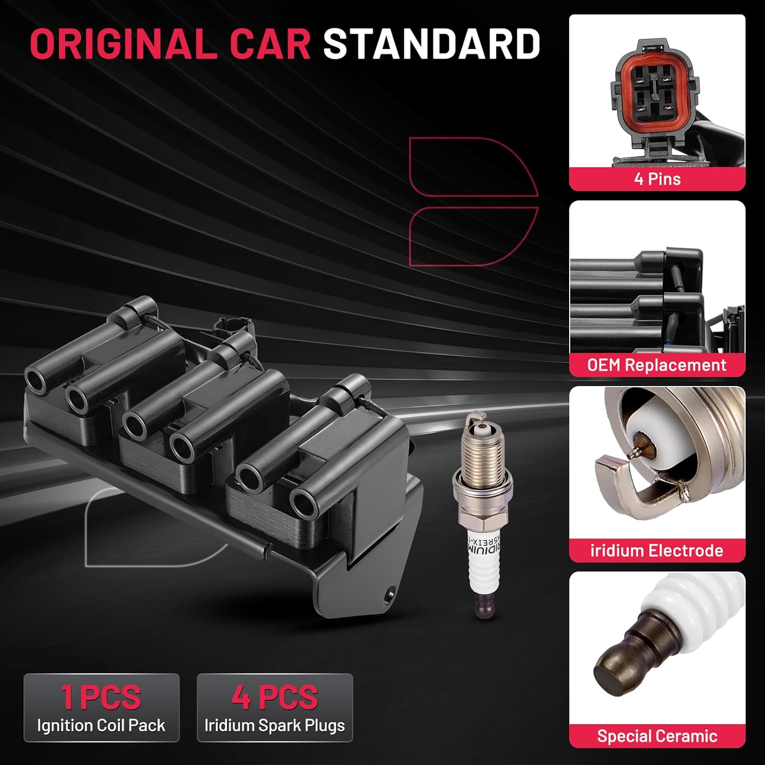 BDFHYK 1 Ignition Coil Pack UF284 and 4 Iridium Spark Plug 5464 Compatible with Hyundai 1999-2001 Sonata; Compatible with Kia 2002-2006 Magentis, 2001-2006 Optima 2.5L 2.7L V6 Coil for C1227 5C1157