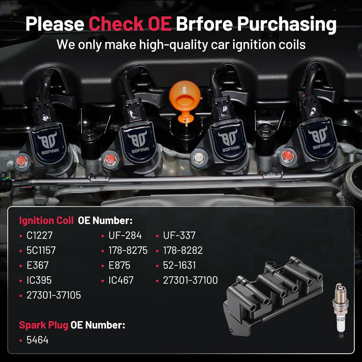 【About BDFHYK】A professional auto parts manufacturer with mature industry lines. We have our factory and experienced developer. It's been more than 10 years that we have served different customers from different areas. We do our best to hear from customers and update our coil packs and spark plugs. If you have more problems, please be free to contact us. Choose BDFHYK,choose good service.