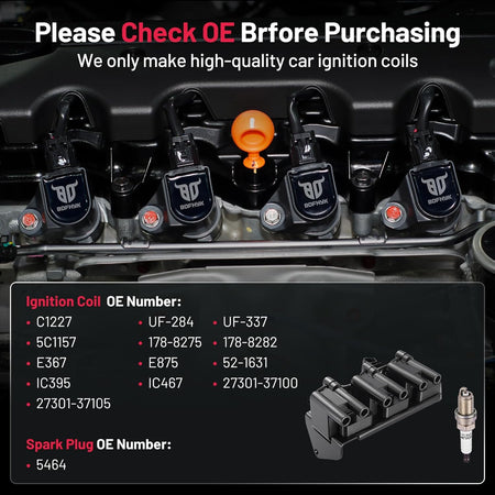 【Yes, you need a new coil and spark plug!】If your car has been used for a long time(over 80000km) and has problems like car shaking, start-up failure, speeding up slowly, and increasing fuel consumption, you may need to change a new set of spark plugs and coil packs. BDFHYK ignition coil packs and spark plugs can offer you a professional user experience and make your car like new. You may choose it with confidence.