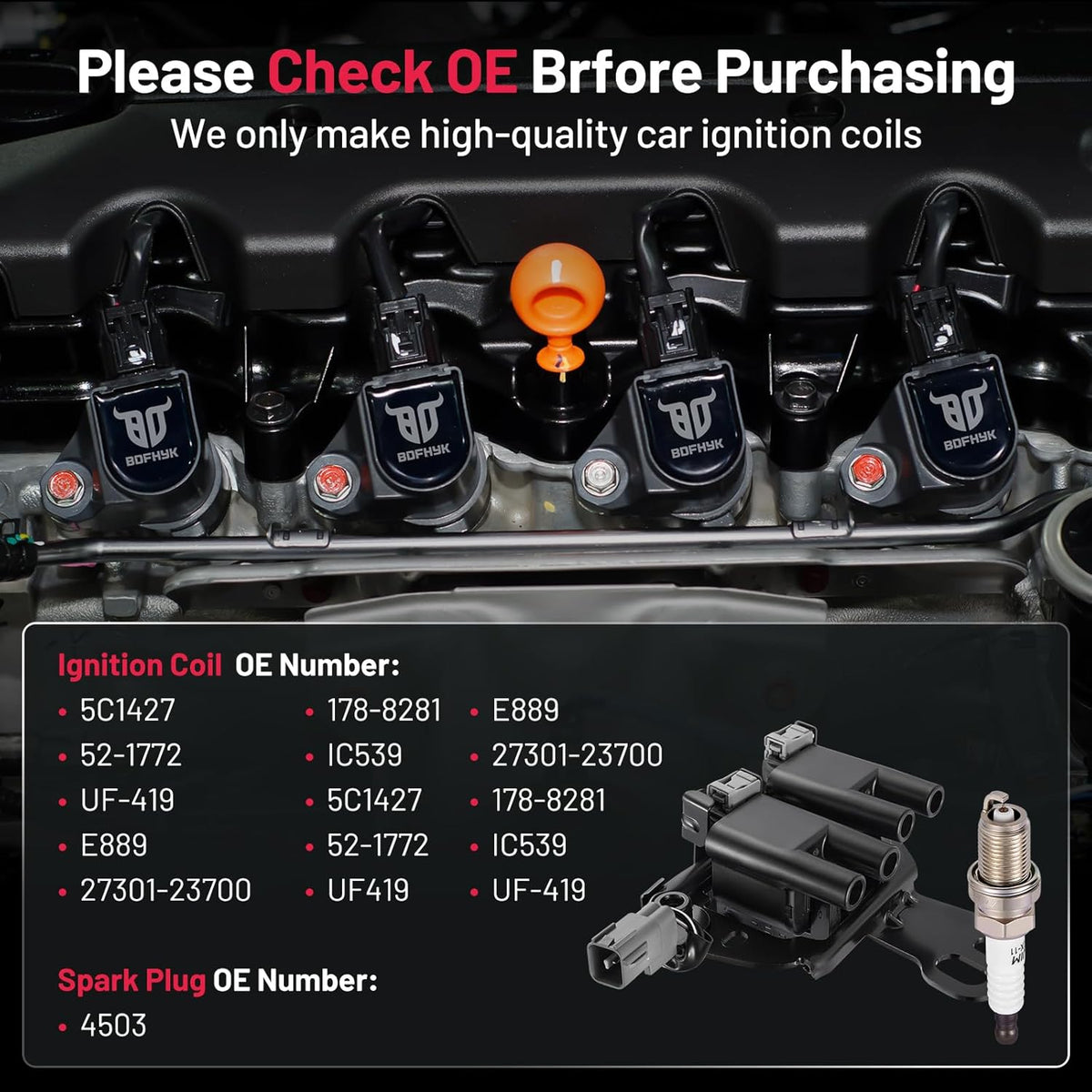 【About BDFHYK】A professional auto parts manufacturer with mature industry lines. We have our factory and experienced developer. It's been more than 10 years that we have served different customers from different areas. We do our best to hear from customers and update our coil packs and spark plugs. If you have more problems, please be free to contact us. Choose BDFHYK,choose good service.