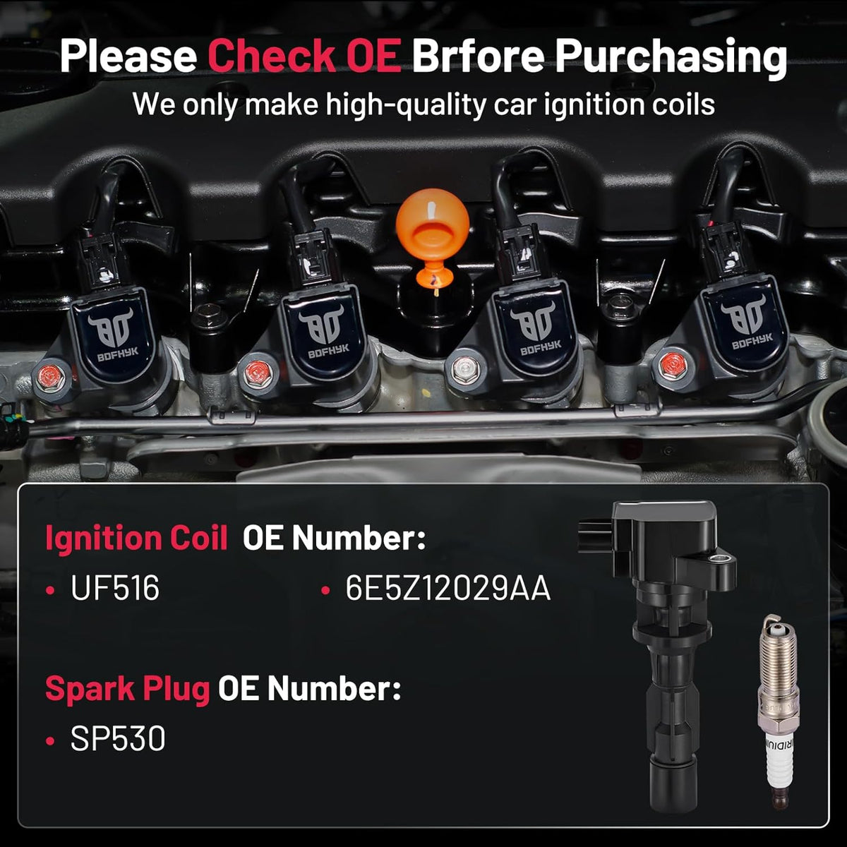 【Features of ignition coil:】High quality ignition coils are made of silicon steel material, Japan-imported rubber, and Germany-imported varnished wire, which makes our coils have a long using life and better quality. ‼Please check OE:UF516 6E5Z12029AA.