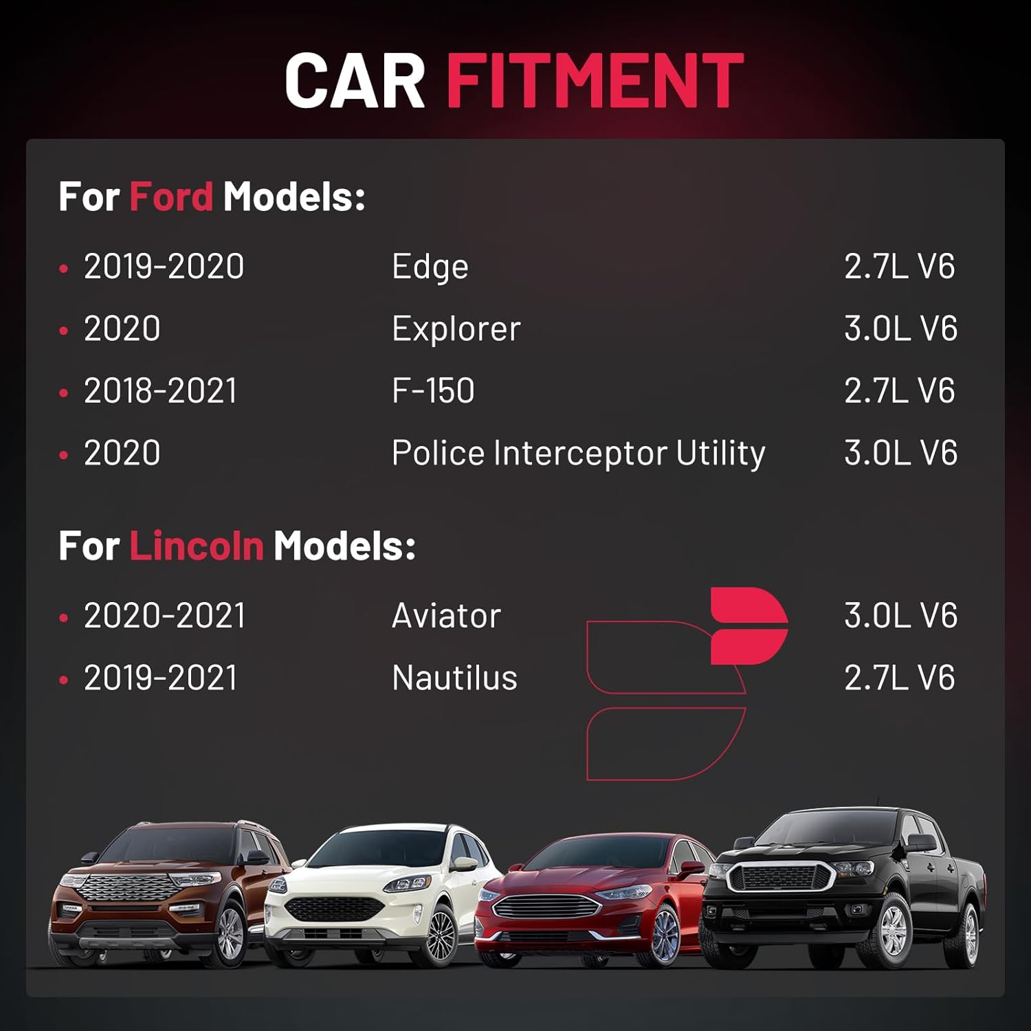 【Basic Info:】Ignition Coil UF827 & Spark Plugs 95927 Compatible with Ford 2019-2020 Edge, 2020 Explorer, 2018-2021 F-150, 2020 Police Interceptor Utility; Compatible with Lincoln 2020-2021 Aviator, 2019-2021 Nautilus. Please check detail fitting info from pics or detail page. Please choose suitable coil pack and plugs with confidence.