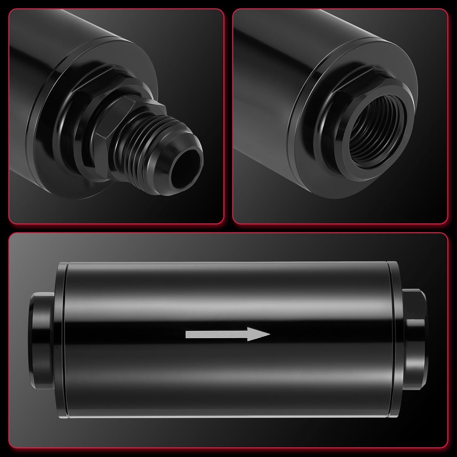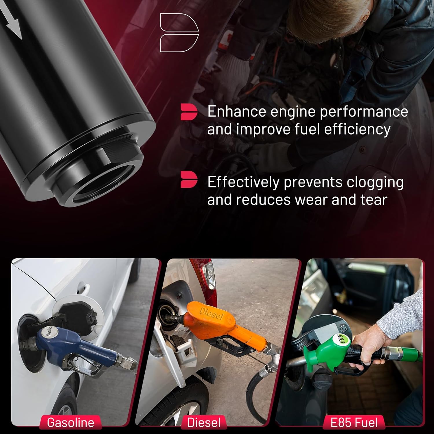 Universal Compatibility: This fuel filter is compatible with gasoline, diesel, and E85 fuels. It includes AN6, AN8, and AN10 adapters, ensuring a versatile fit for various fuel system sizes in different vehicles
