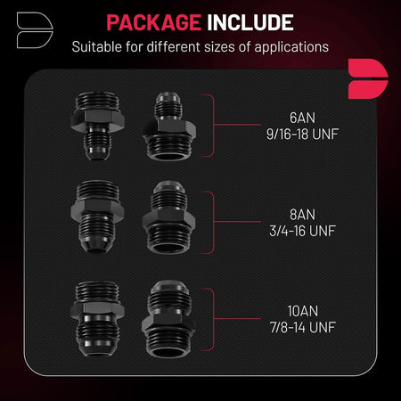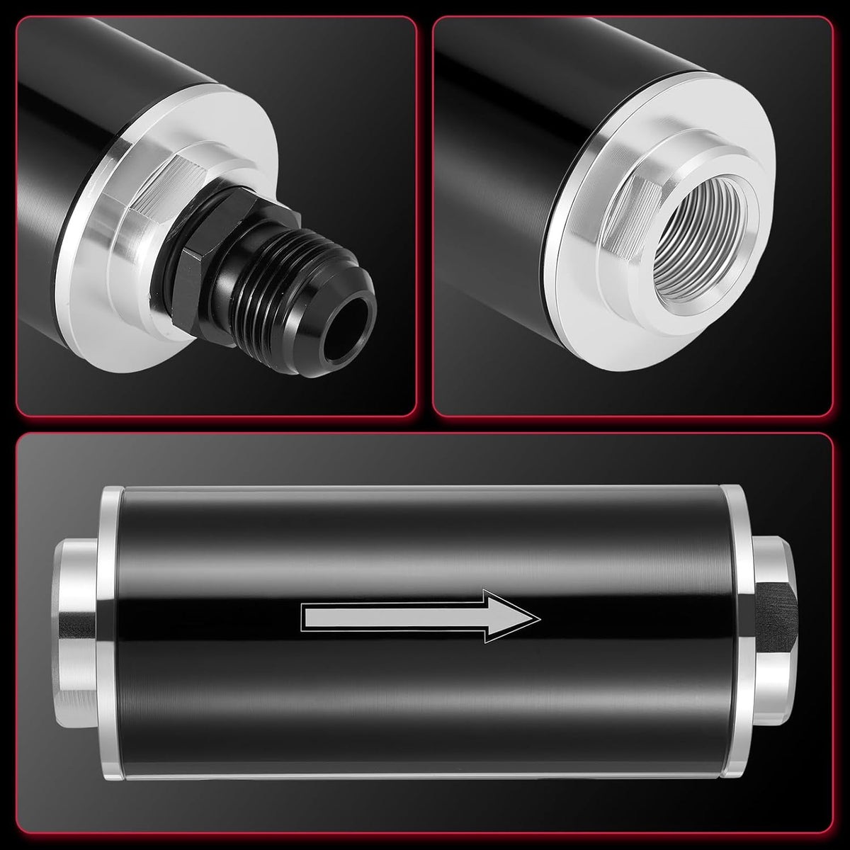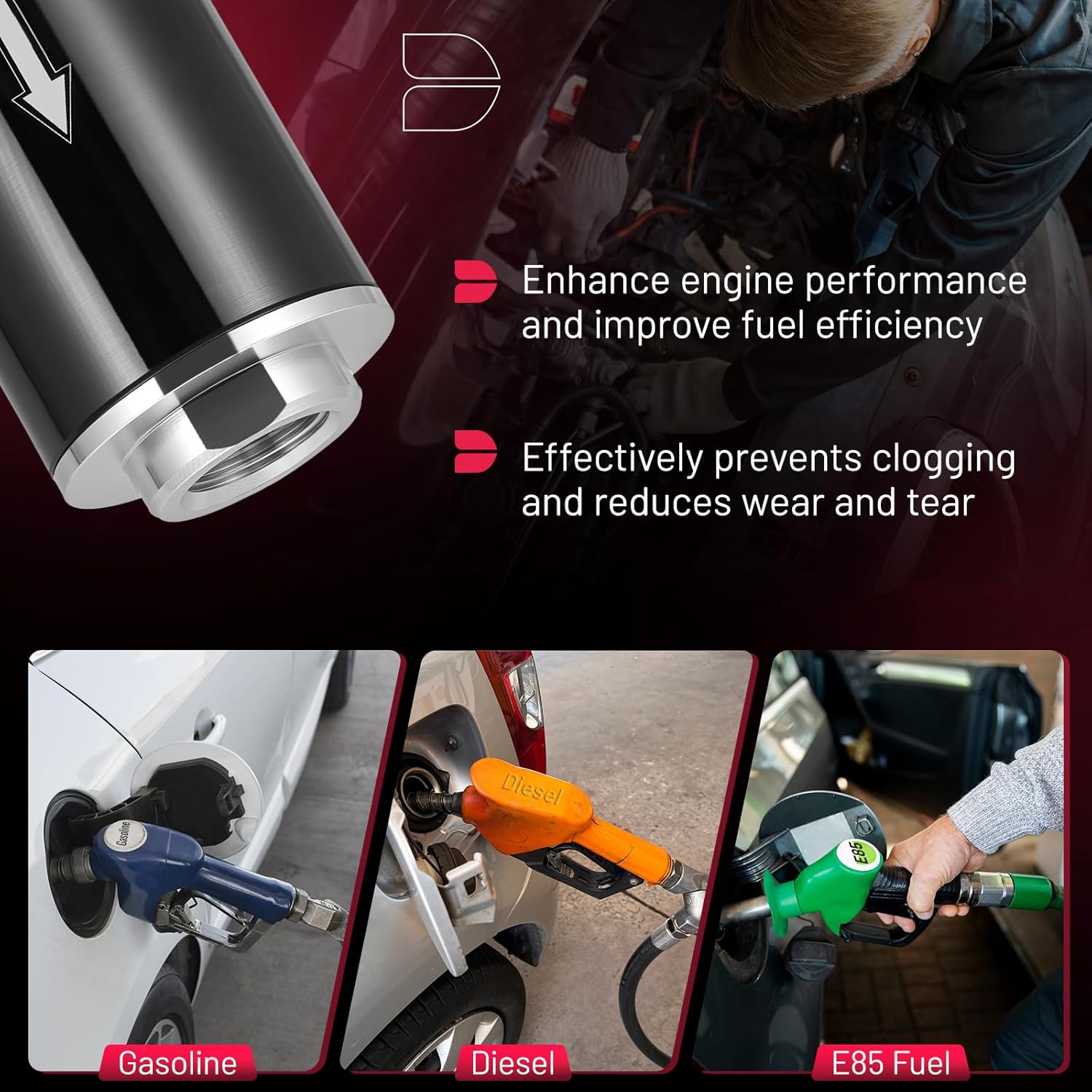 Universal Compatibility: This fuel filter is compatible with gasoline, diesel, and E85 fuels. It includes AN6, AN8, and AN10 adapters, ensuring a versatile fit for various fuel system sizes in different vehicles