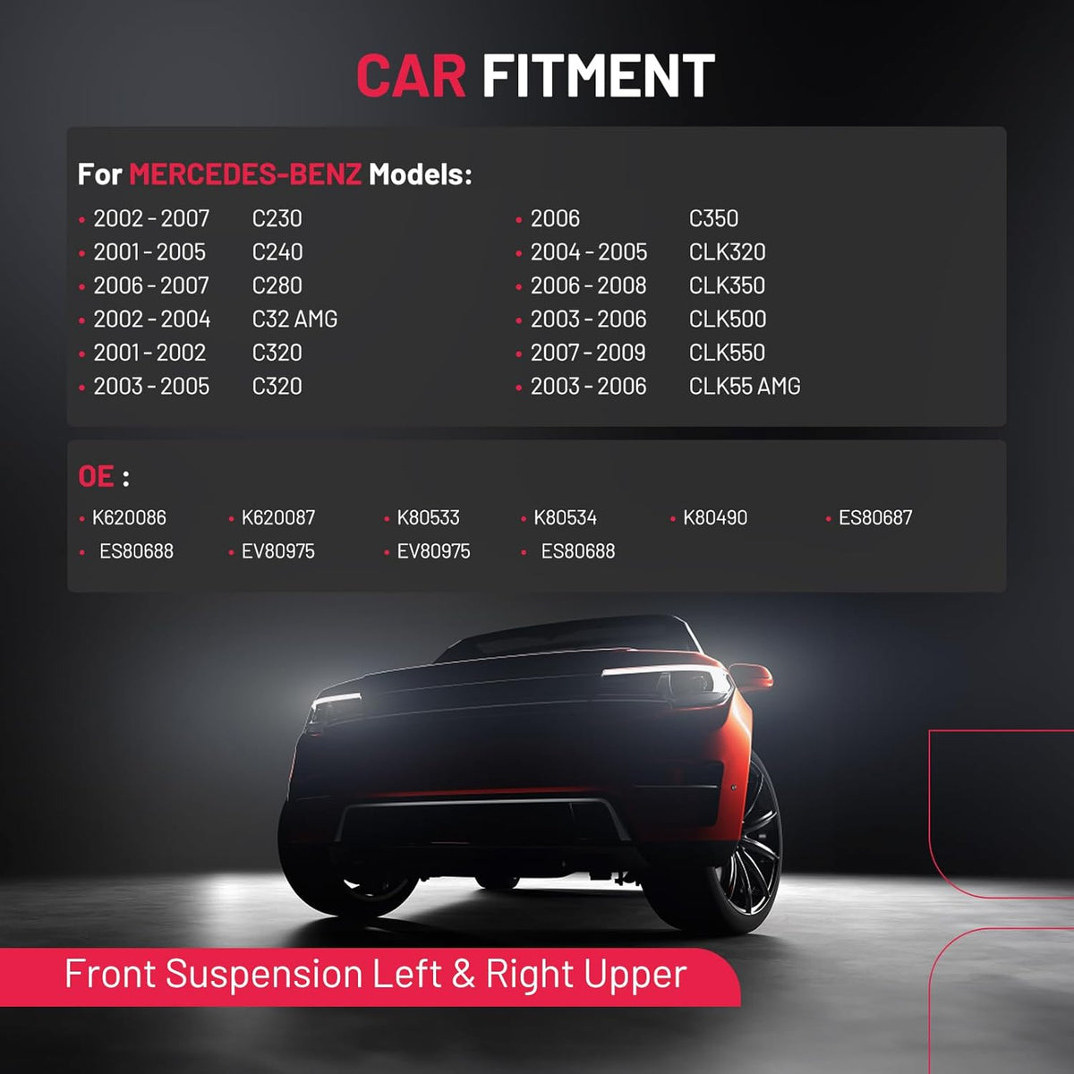 【Compatible with】 Compatible with Mercedes-Benz C230 2002-2007; C240 2001-2005 RWD; C280 2006-2007 RWD; C32 AMG 2002-2004; C320 2001-2005 RWD Base; C350 2006 RWD; CLK320 2004-2005; CLK350 2006-2008; CLK500 2003-2006; CLK550 2007-2009; CLK55 AMG 2003-2006; all with 10mm sway bar link stud size; without sport suspension.