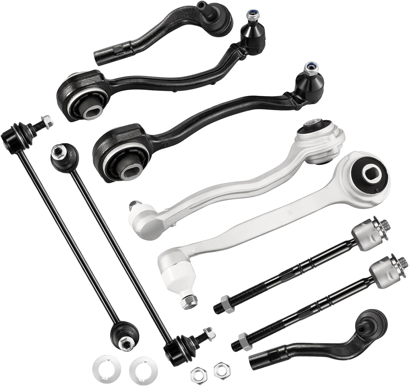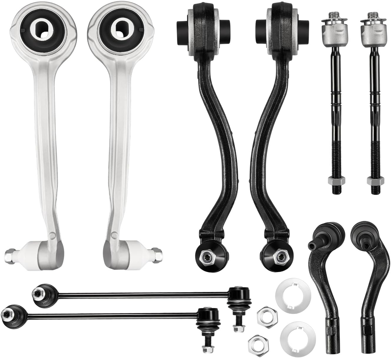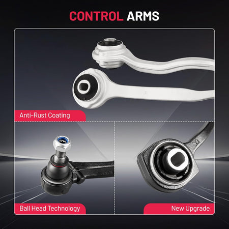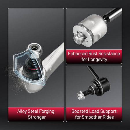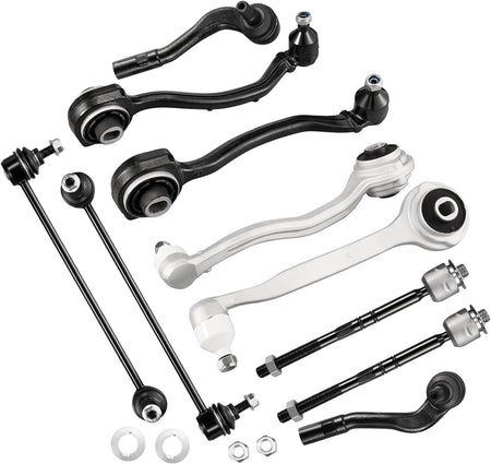 【Products contain】1x Front Lower Control Arm + Ball Joint (Forward Position - Driver); 1x Front Lower Control Arm + Ball Joint (Forward Position - Passenger) ; 1x Front Lower Control Arm + Ball Joint (Rearward Position - Driver); 1x Front Lower Control Arm + Ball Joint (Rearward Position - Passenger); 1x Front Outer Tie Rod End Link (Driver); 1x Front Outer Tie Rod End Link (Passenger); 2x Front Inner Tie Rod End Link; 2x Front Stabilizer / Sway Bar End Link