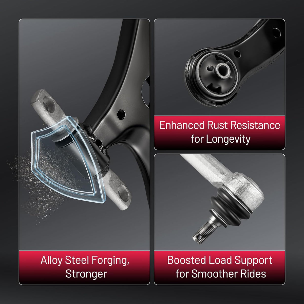 【Control Arm Features】 The control arm improves stability, handling, and driving comfort, with a protective finish that helps extend service life. Made from forged alloy steel, it delivers reliable performance, reduces noise, and ensures accurate fitment for safe and consistent driving