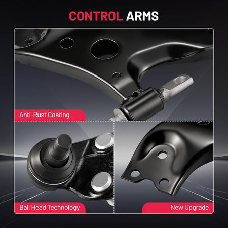 【Products contain】1x Front Left Lower Control Arm Assembly - K620334; 1x Front Right Lower Control Arm Assembly - K620333; 1x Front Driver Side Lower Ball Joint - K90346; 1x Front Passenger Side Lower Ball Joint - K90347; 2x Front Driver and Passenger Side Inner Tie Rod Ends - EV420; 1x Front Driver Side Outer Tie Rod End - ES80603; 1x Front Passenger Side Outer Tie Rod End - ES80602; 2x Tie Rod Boots + Bellows w/Locking C-Clamps