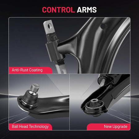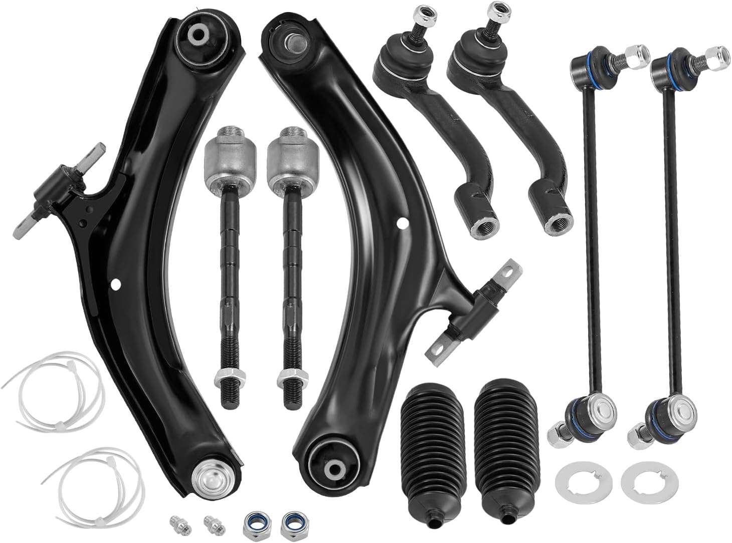 【Products contain】1x Front Lower Control Arm w/ Ball Joint Assembly - Driver Side - MS30194; 1x Front Lower Control Arm w/ Ball Joint Assembly - Passenger Side - MS30195; 1x Front Sway Bar End Link - Driver Side - K750095 ; 1x Front Sway Bar End Link - Passenger Side - K750094; 1x Outer Tie Rod End - Driver Side - ES800583; 1x Outer Tie Rod End - Passenger Side - ES800582; 2x Inner Tie Rod Ends - EV800550; 2x Front Rack & Pinion Boots