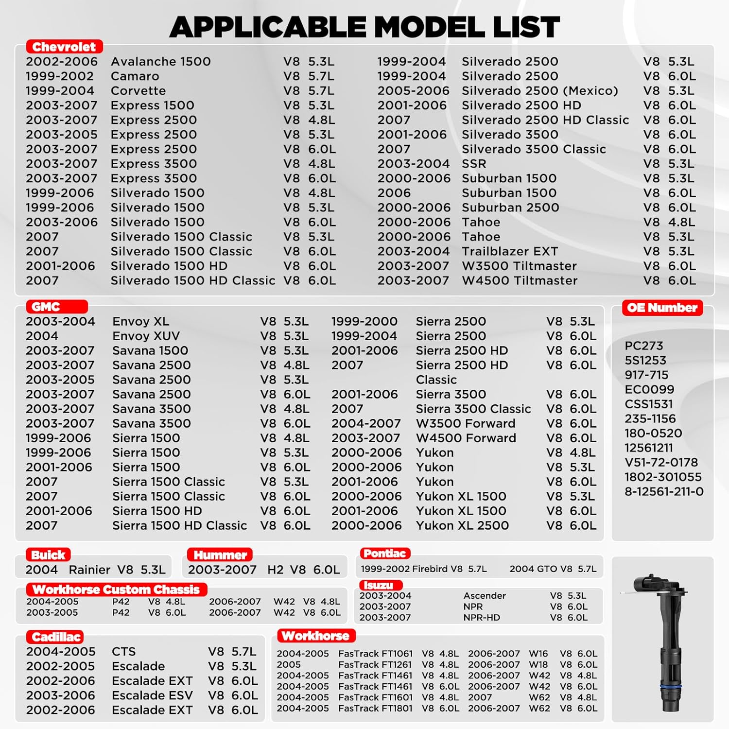 Compatible Models: CHEVROLET (CHEVY) AVALANCHE 1500 02-06, CAMARO 99-02, CORVETTE 99-04, EXPRESS 1500 2500 3500 03-07, SILVERADO 1500 99-06 CLASSIC 07, SILVERADO 2500 99-06 CLASSIC 07, SILVERADO 3500 01-06 CLASSIC 07, SSR 03-04, TAHOE 00-06
