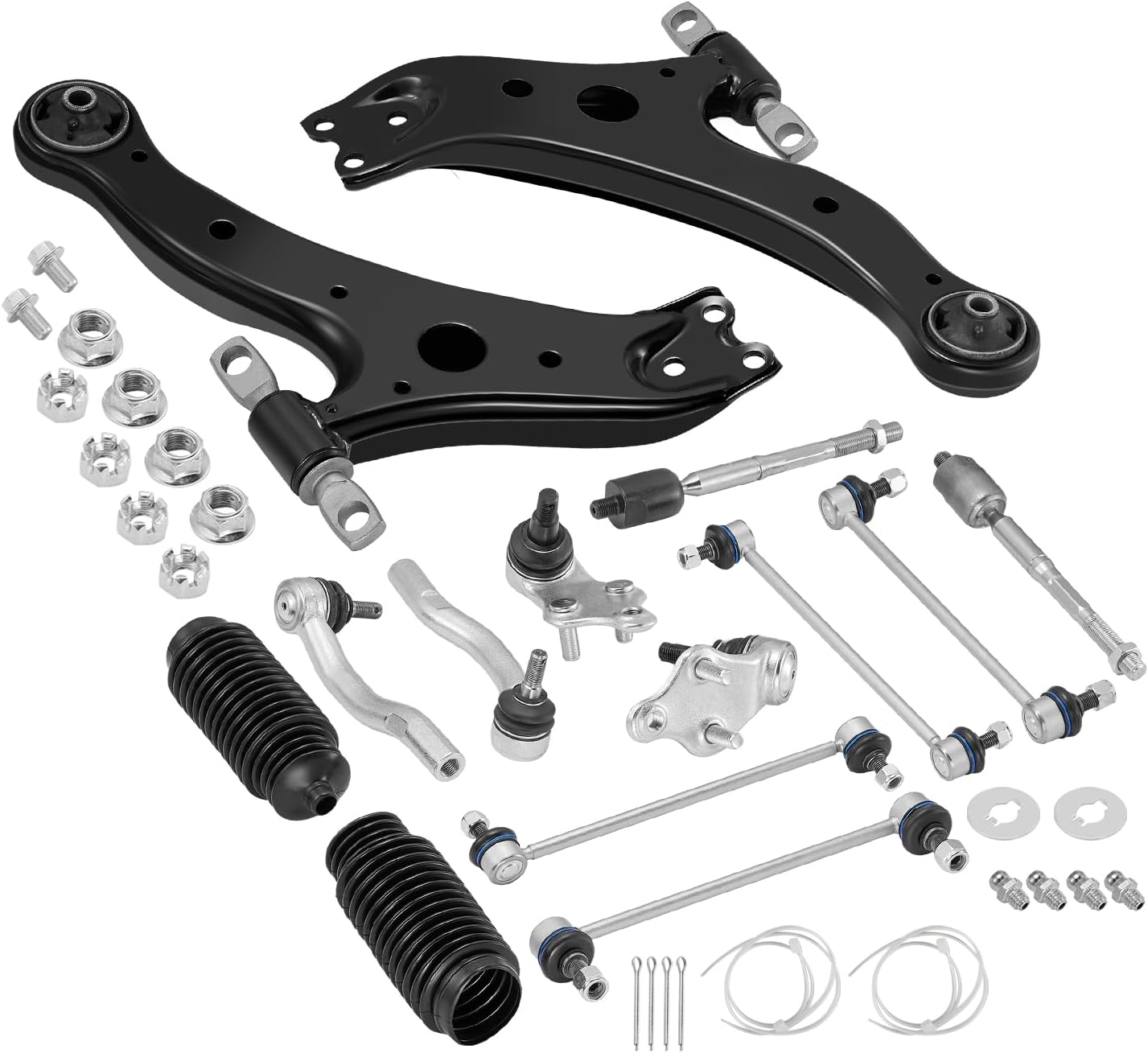 【Products contain】1x Front Lower Control Arm Driver K620334, 1x Passenger K620333; 1x Front Lower Ball Joint Driver K500044, 1x Passenger K500043; 1x Front Outer Tie Rod End Driver ES80603, 1x Passenger ES80602; 2x Front Inner Tie Rod End Link EV800306; 2x Front Stabilizer / Sway Bar End Link K750123; 2x Rear Stabilizer / Sway Bar End Link K750011; 2x Rack and Pinion Tie Rod Boot & Bellows w/locking C-clamp