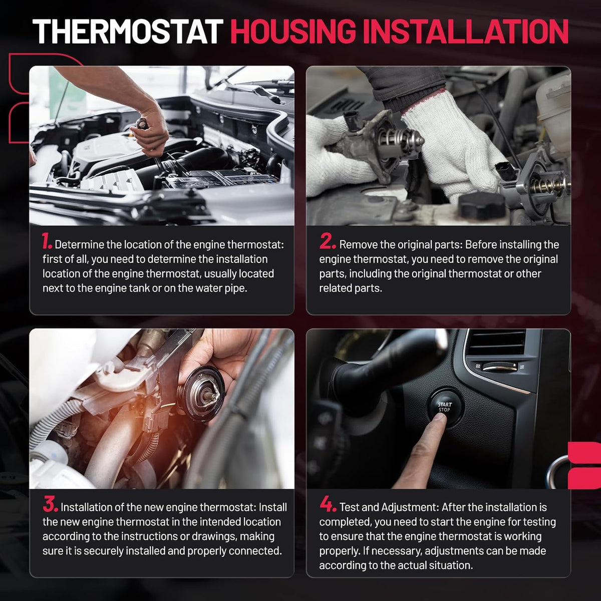 【Function】:Thermostat Housing Assembly is to regulate the temperature of the engine by controlling the flow of coolant through the radiator. The thermostat opens and closes based on the temperature of the engine, allowing coolant to flow through the radiator when the engine is too hot and restricting flow when the engine is too cold. This helps to maintain the engine at an optimal operating temperature, which improves fuel efficiency and prolongs the life of the engine.
