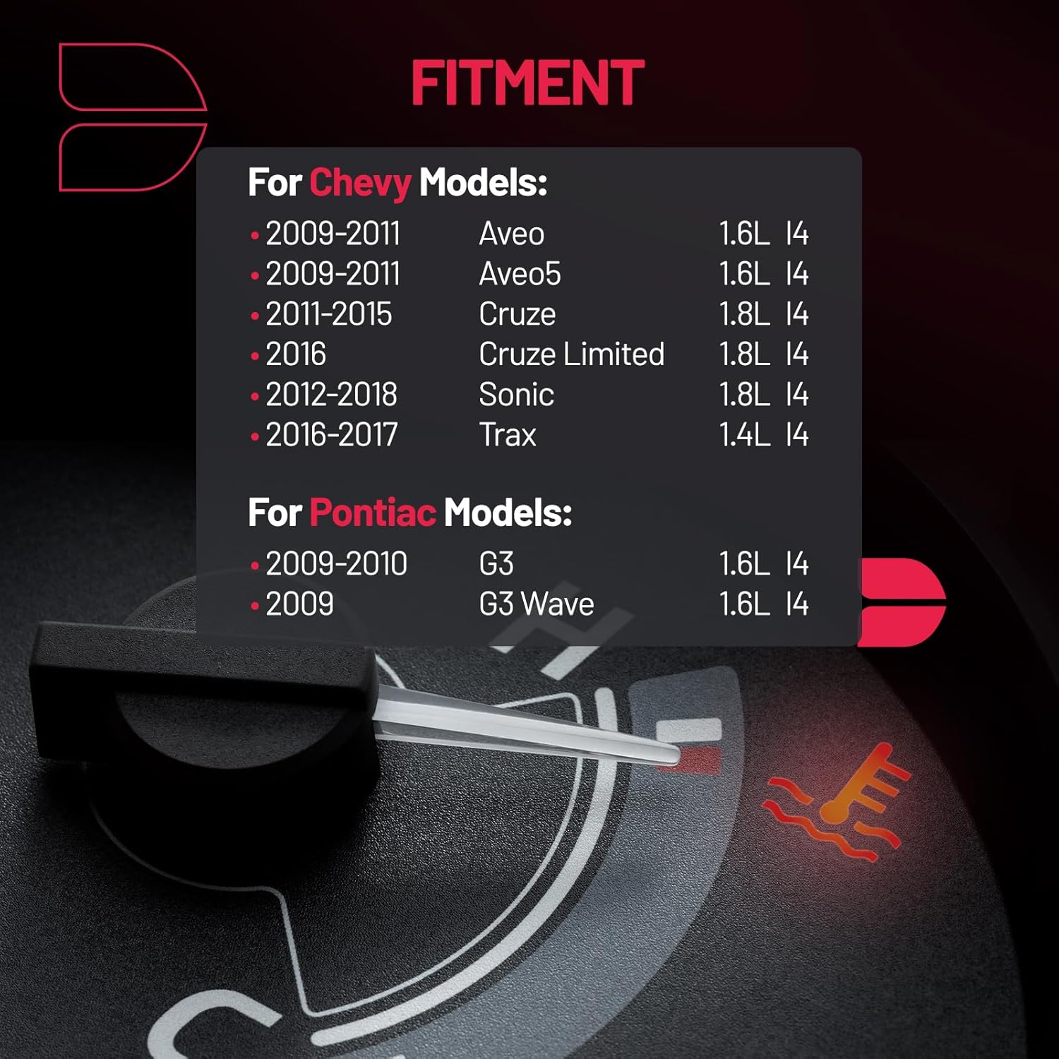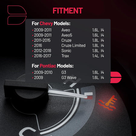 【Fitment information】:Thermostat Housing Assembly Compatible with Chevy 2009-2011 Aveo, 2009-2011 Aveo5, 2011-2015 Cruze, 2016 Cruze Limited, 2012-2018 Sonic, 2016-2017 Trax; Compatible with Pontiac 2009-2010 G3, 2009 G3 Wave. Engine fitment:1.4L 1.6L 1.8L L4.