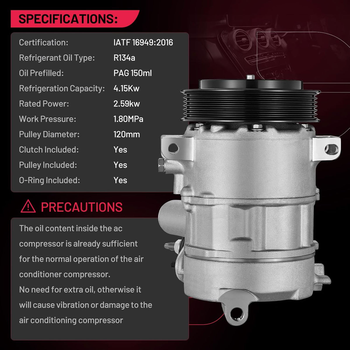 Easy Installation - The Air Conditioning A/C Compressors come pre-charged with PAG oil for R134a applications, come with the R134A required o-rings /sealing washers and direct fit connectors for ease of installation