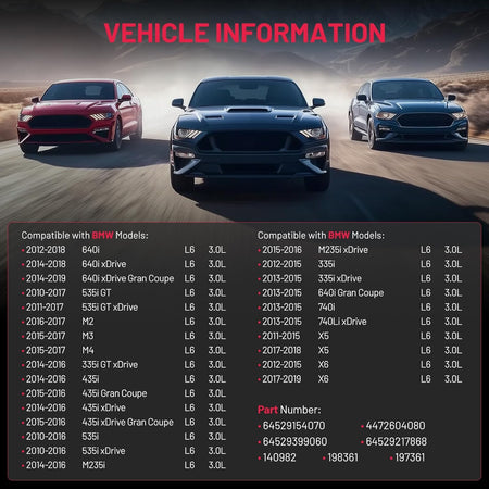 Part Number - Replace# 64529154070, 4472604080, 64529399060, 64529217868, 140982, 198361, 197361. Compatible with BMW: 535i L6 3.0L 2010-2016, 535i xDrive L6 3.0L 2010-2016, M235i L6 3.0L 2014-2016, M235i xDrive L6 3.0L 2015-2016, 335i L6 3.0L 2012-2015, 335i xDrive L6 3.0L 2013-2015, 640i Gran Coupe L6 3.0L 2013-2015, 740i L6 3.0L 2013-2015, 740Li xDrive L6 3.0L 2013-2015, X5 L6 3.0L 2011-2015, X5 L6 3.0L 2017-2018, X6 L6 3.0L 2012-2015, X6 L6 3.0L 2017-2019