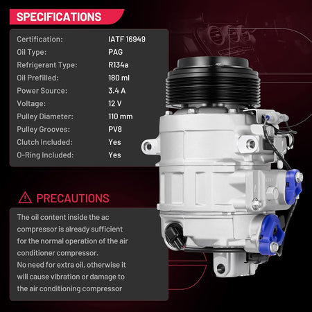 Friendly Installation - All-Inclusive Kit: Pre-Charged Oil, PAG 46, OEM-grade O-rings/Sealing Washers – Plug-and-Play Direct Fit. NOTE: Please use "amazon confrmed fit" tool to enter your year, make, and model to avoid mismatch with the model can not be used.