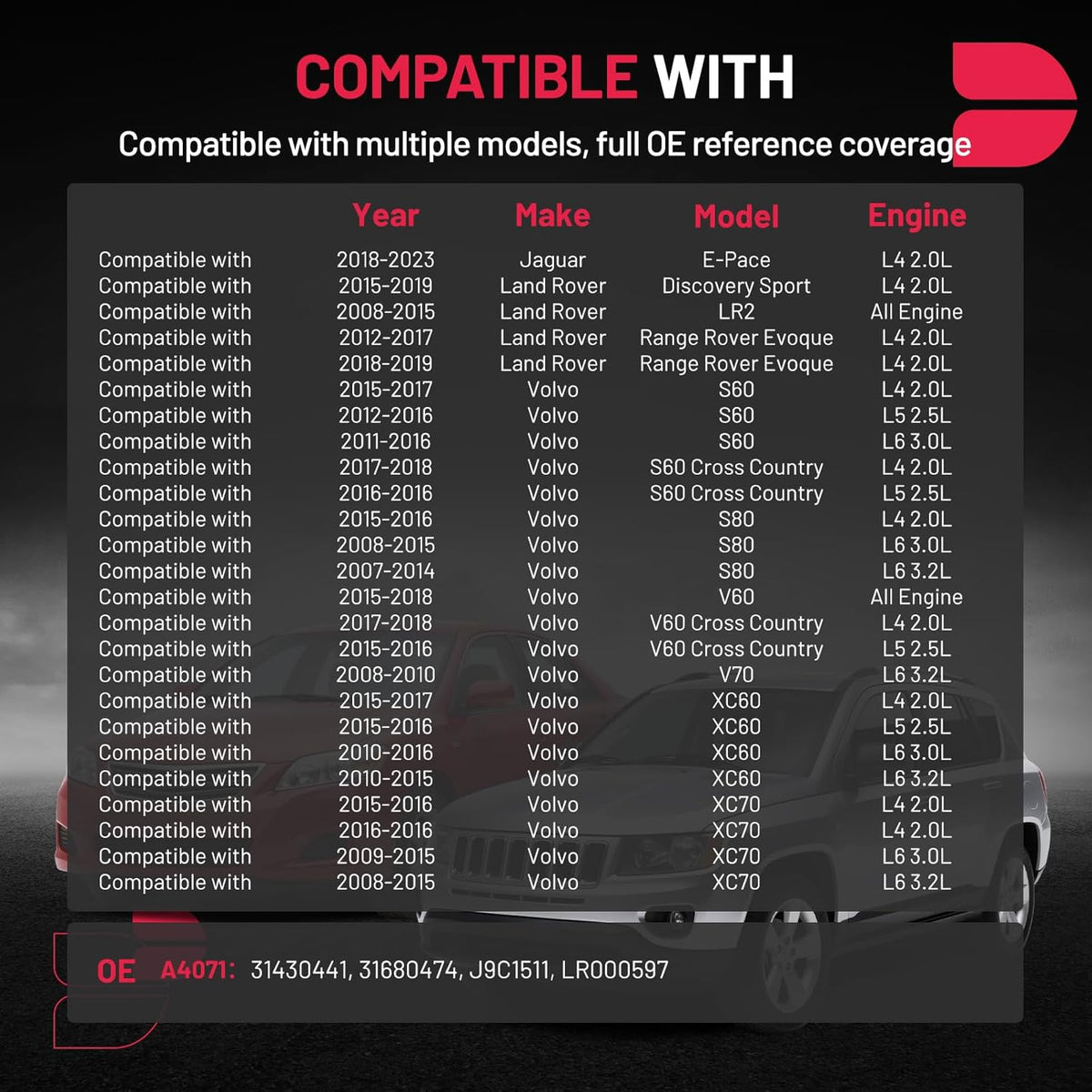 【Compatible with】Compatible with Jaguar E-Pace 2018-2023 2.0L L4, Compatible with Land Rover Discovery Sport/LR2/Range Rover Evoque 2008-2019 2.0L L4, Compatible with Volvo S60/S60 Cross Country/S80/V60/V60 Cross Country/V70/XC60/XC70 2007-2018 2.0L L4, 2.5L L5, 3.0L L6, 3.2L L6
