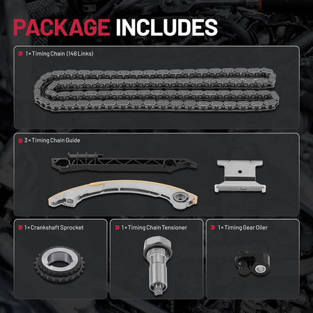 [Package Includes]: 1 x Timing Chain(148 Links), 1 x Crankshaft Sprocket, 1 x Timing Chain Tensioner, 3 x Timing Chain Guide, 1 x Timing Gear Oiler