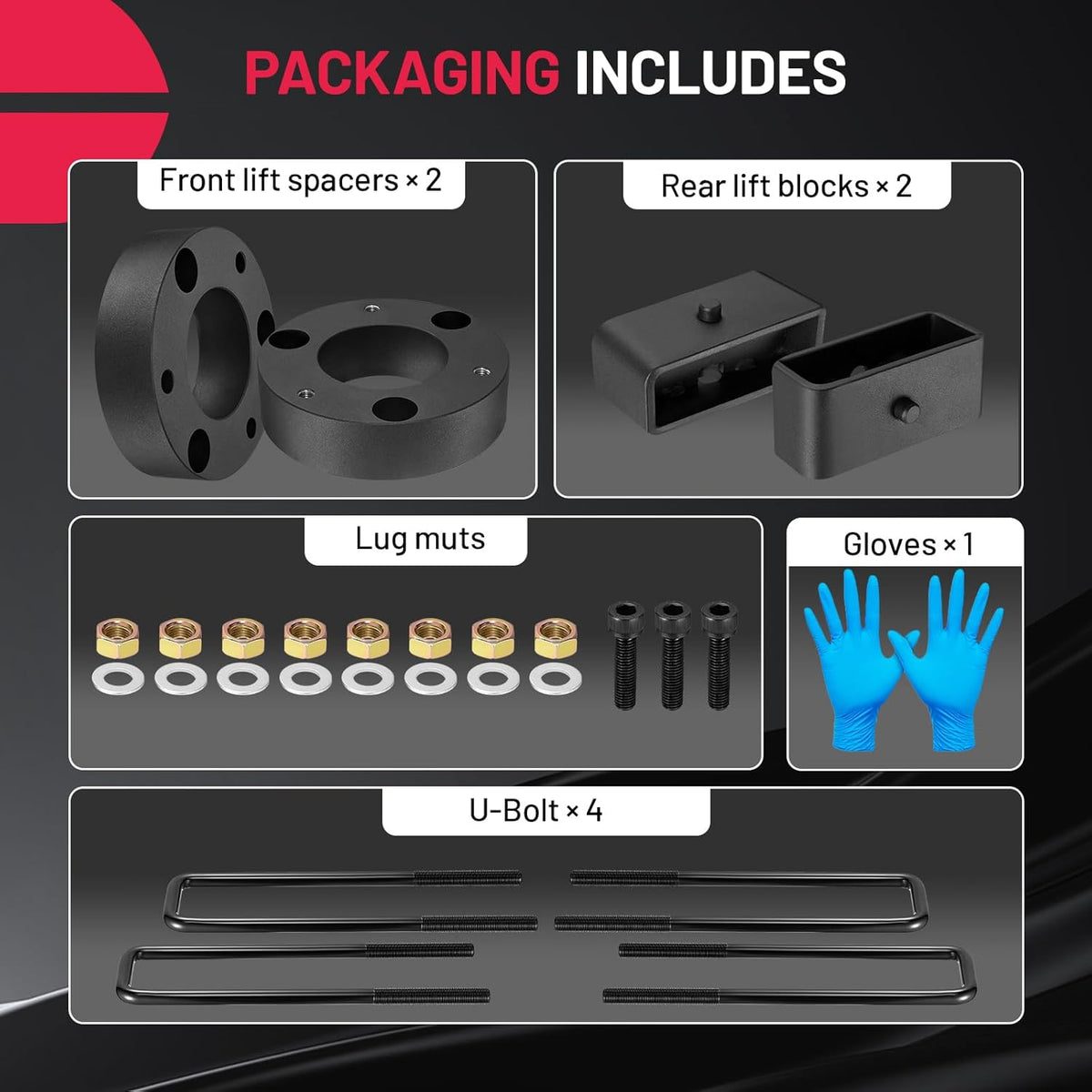 【Product Use】Generally, the car is not completely flat when driving on the road. Front lift kits are to raise the factory rake of your vehicle, make the front and rear of the car level. Increase the distance between the frame and the ground, make the vehicle look more perfect and cool. But it will never lessen your comfort level, making you more relaxed and enjoyable driving.