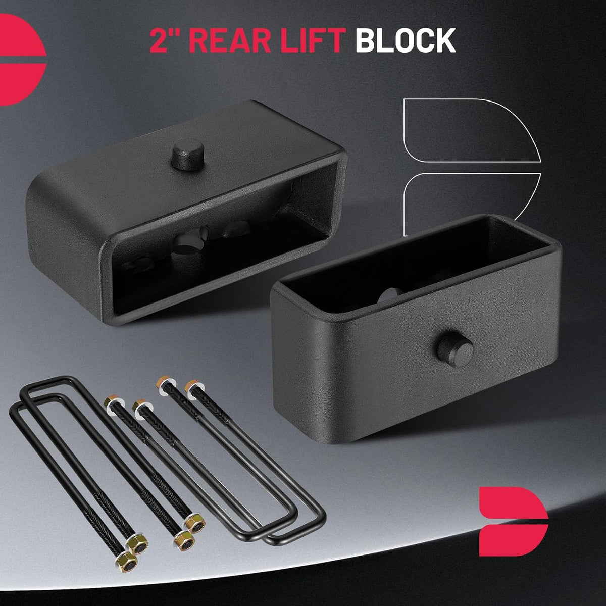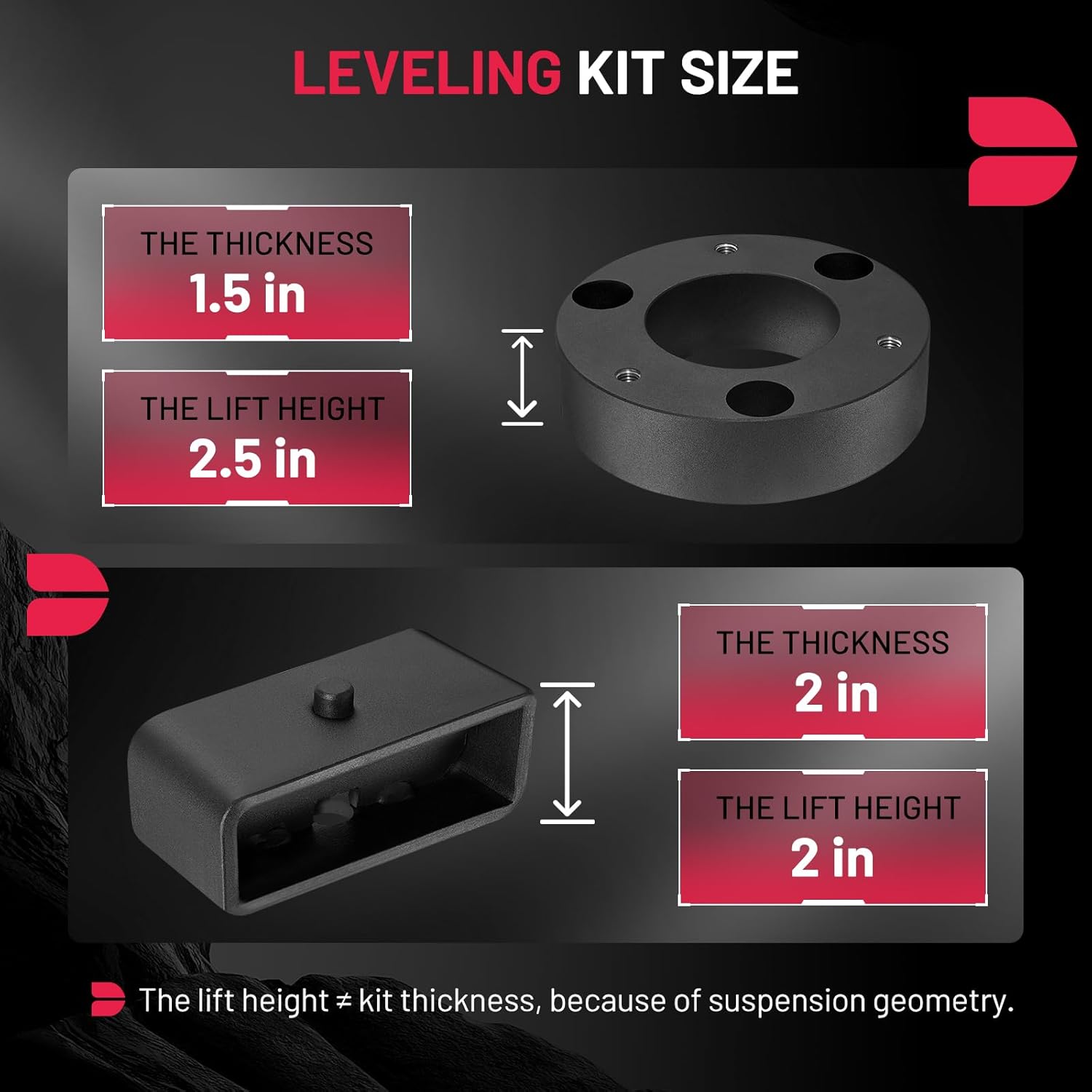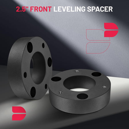 【Function】Improves the look of your vehicle and provides additional fender clearance for larger tires and wheels. With your truck's newly added height, your undercarriage will be a lot safer from damaging road obstacles. Note: The thickness of the leveling Lift Kit will raise your truck by 2 inches at the rear and 2.5 inches at the front. The ratio of the front lifting height to the thickness of the lift kit is not 1:1, this is due to suspension geometry.