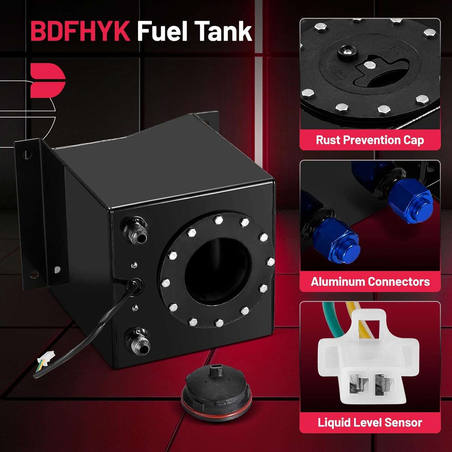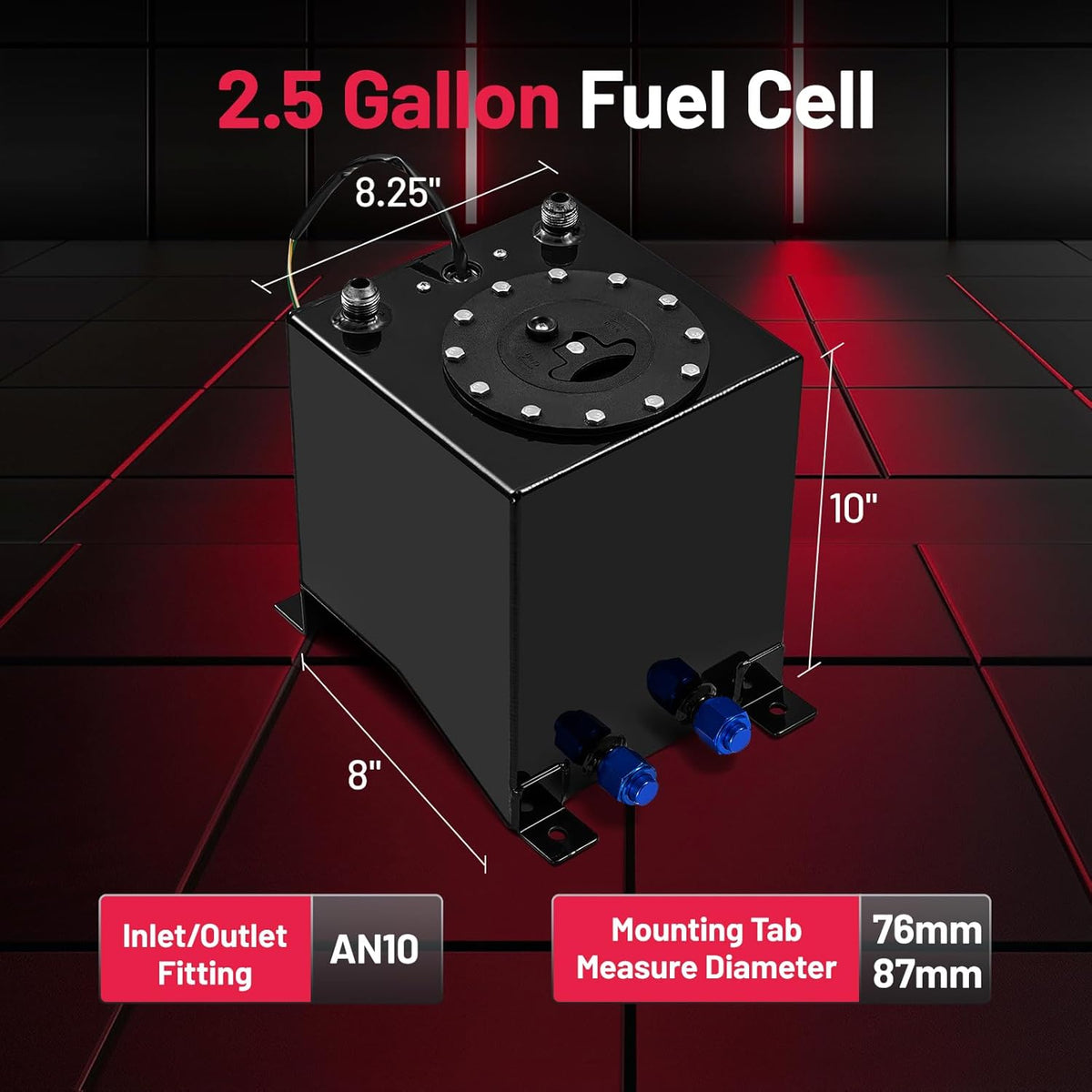 Package includes: 1 x Aluminum 2.5 Gallon Fuel Cell with built-in level sensor (3-90 ohm) and splash-proof foam. This fuel tank is universal compatible with hot rods/street racing/track cars/trucks/SUVs etc.