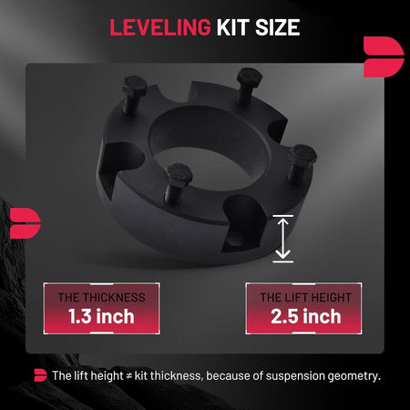 ️NOTE: 2.5in Toyota front leveling kit, please note that spacer thickness to lift height, not 1:1 ratio.The thickness of a 2.5in gasket is 1.3in, but the height after lifting is 2.5in. No disassembling strut coils assemblies and drilling, just install the leveling kit for toyota tacoma go on the top of the strut and fix it bolt. ️Warm tip: the description mentioned 2in/2.5in/3in is the adjusted lifting height, not the thickness of the product itself!