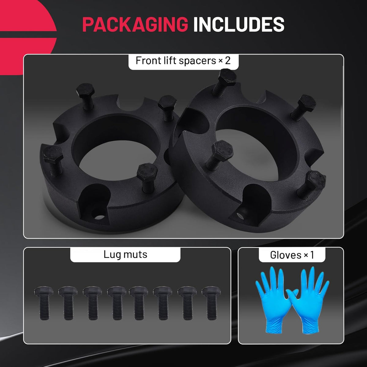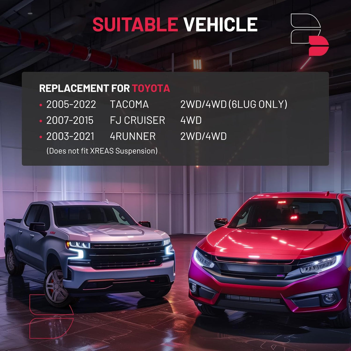 Compatible Car Models: 2.5 inch front suspension leveling kit fits Compatible with Toyota 2005-2022 Tacoma 2WD/4WD (6 lugs only) ️Warm tip: Does NOT fit models with 5 lug wheels, take care to check the number of lug wheels to avoid mismatching installation. 2003-2021 4Runner 2WD/4WD (Does not fit XREAS Suspension!!!), 2007-2015 FJ Cruiser 2WD/4WD.