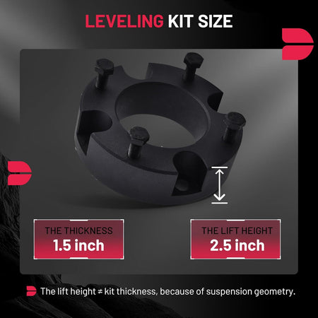 【NOTE】2.5 inch Front Leveling Kit, Please note that spacer thickness to lift height, Lift Spacer Thickness and Lift is not 1:1 Ratio.