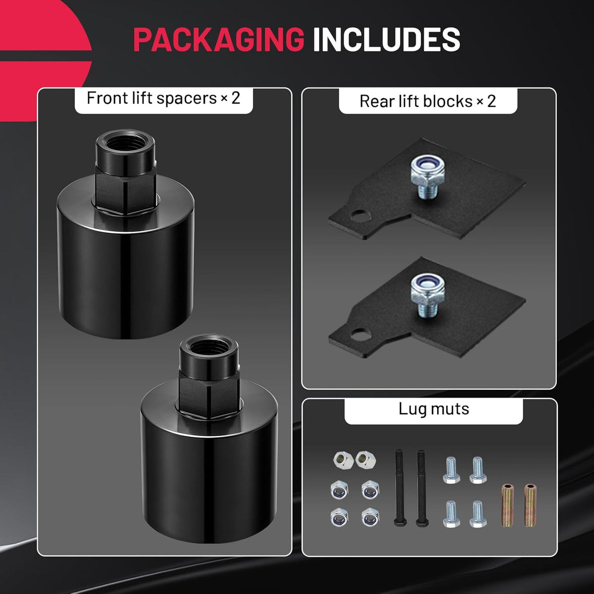 【PRODUCT USAGE】When driving an off-road vehicle, the road surface is uneven. Front and rear lift kits are designed to increase your vehicle's factory front camber to keep your vehicle level front and rear. Increase the distance between the frame and the ground to make your driving easier and more enjoyable.