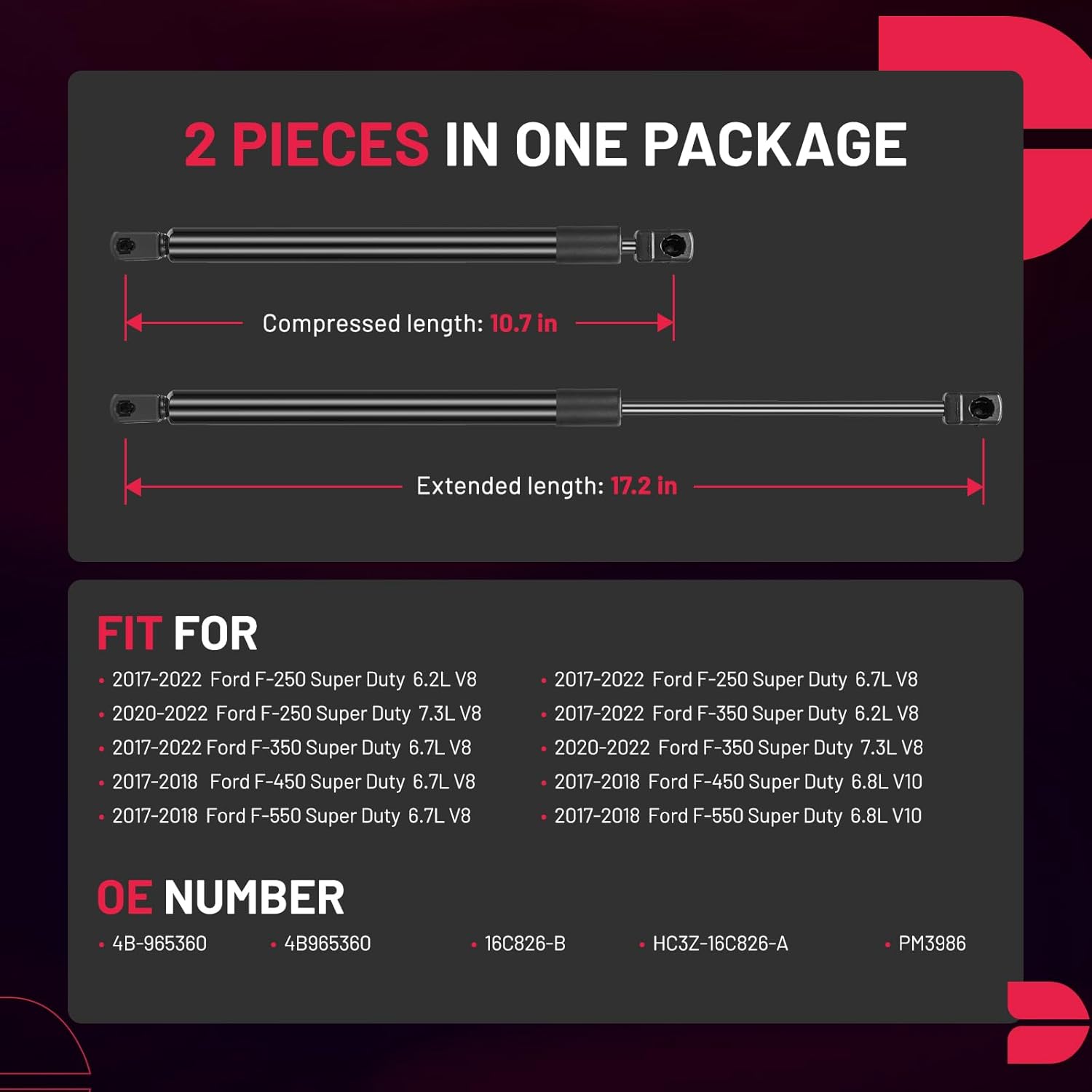 【Basic Info】BDFHYK lift supports are compatible with 2017-2022 F-250 F-350 Super Duty,2017-2018 F-450 F-550 Super Duty. It has 2 items in one set and is installed at Rear Hatch. It is 10.7in compressed and 17.2in extended. No ball studs.