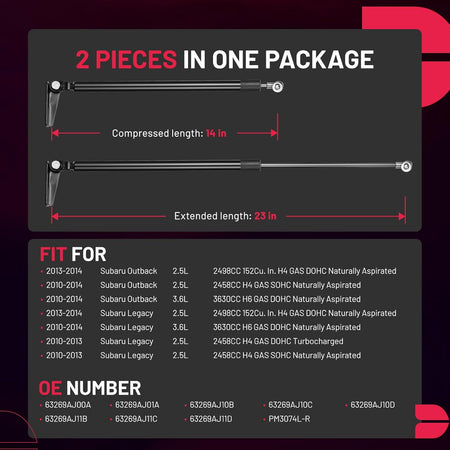【Basic Info】BDFHYK lift supports are compatible with Subaru 2010-2014 Outback,2010-2014 Legacy. It has 2 items in one set and is installed at Rear Hatch. It is 14in compressed and 23in extended. No ball studs.
