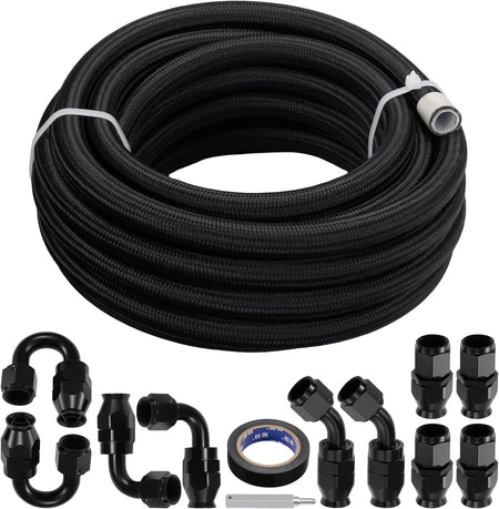 Package Includes: 1x 20FT PTFE Braided Fuel Line;4x AN8 Straight Swivel Hose Ends;2x AN8 45-Degree Swivel Hose Ends;2x AN8 90-Degree Swivel Hose Ends;2x AN8 180-Degree Swivel Hose Ends;1x Insulation tape;1x Installation Tool