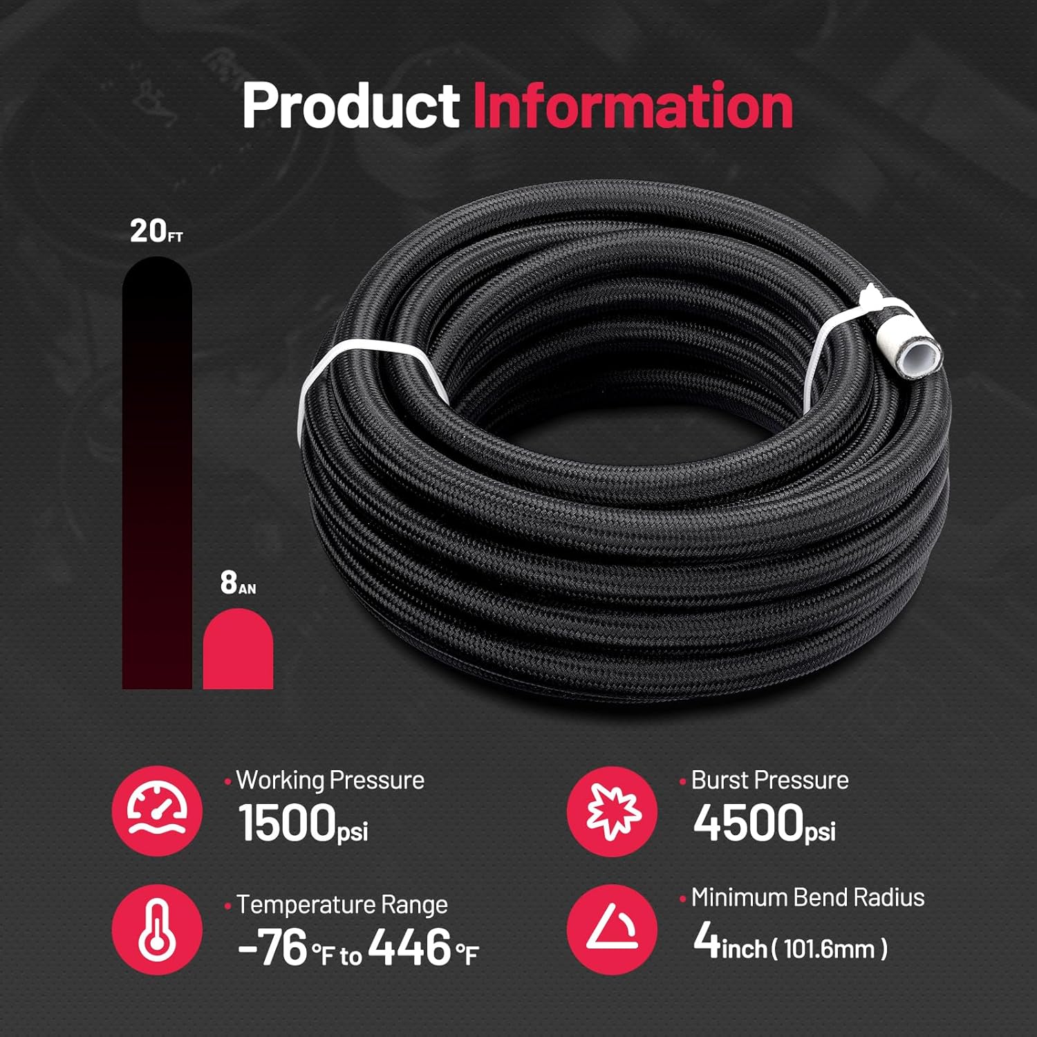 Material: This PTFE fuel line hose is designed to withstand high temperatures and high pressure, ensuring exceptional durability and longevity. The middle layer features stainless steel braiding for reinforcement, while the outer layer is wrapped in black nylon fiber for added protection and strength
