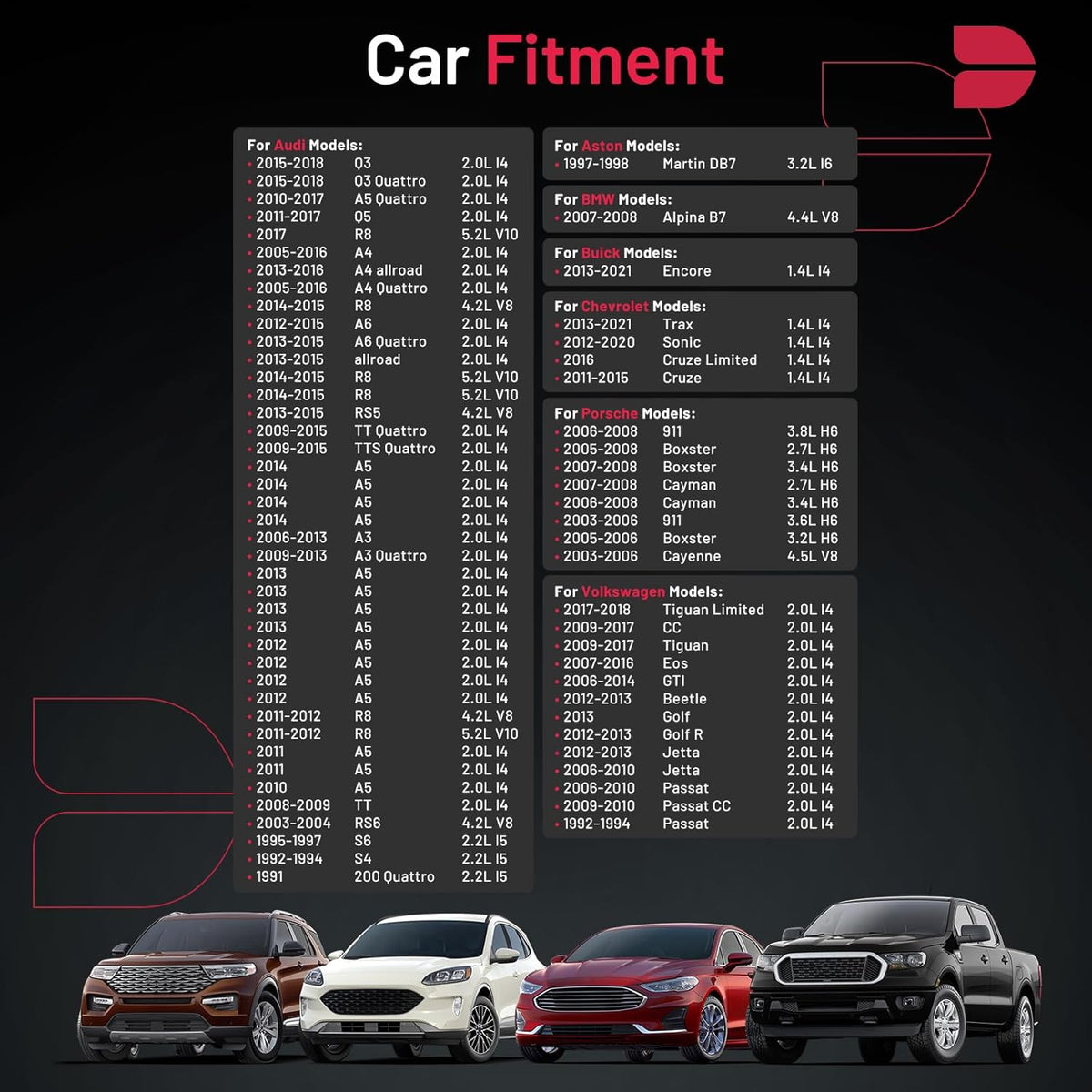 【Compatibility Information】:Spark Plug 2667 Compatible with Aston Martin DB7; Compatible with Audi 200 Quattro A3 A4 A5 A4 A6 Q3 Q5 Quattro allroad R8 RS5 RS6 S4 S6 TT TTS Quattro; Compatible with BMW Alpina B7; Compatible with Buick Encore; Compatible with Chevy Cruze Cruze Limited Sonic Trax; Compatible with Porsche 911 Boxster Cayenne Cayman; Compatible with Volkswagen Beetle CC Eos Golf R GTI Jetta Passat Passat CC.Please see images or details page for complete Compatibility information.