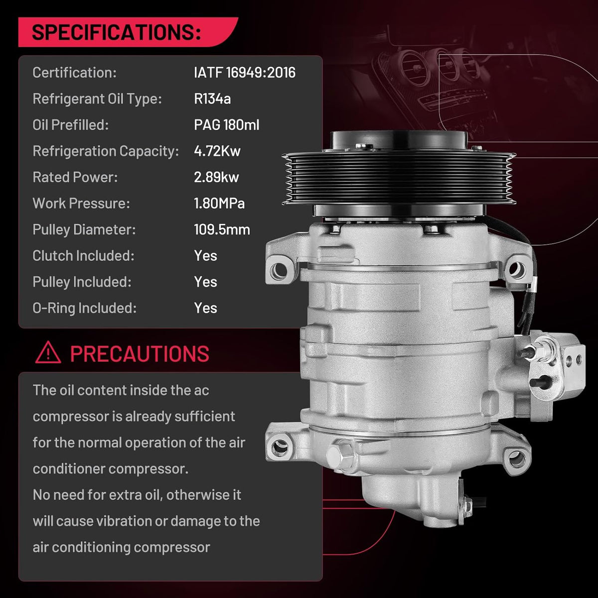 Easy Installation - The Air Conditioning A/C Compressors come pre-charged with PAG oil for R134a applications, come with the R134A required o-rings /sealing washers and direct fit connectors for ease of installation