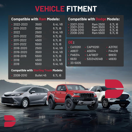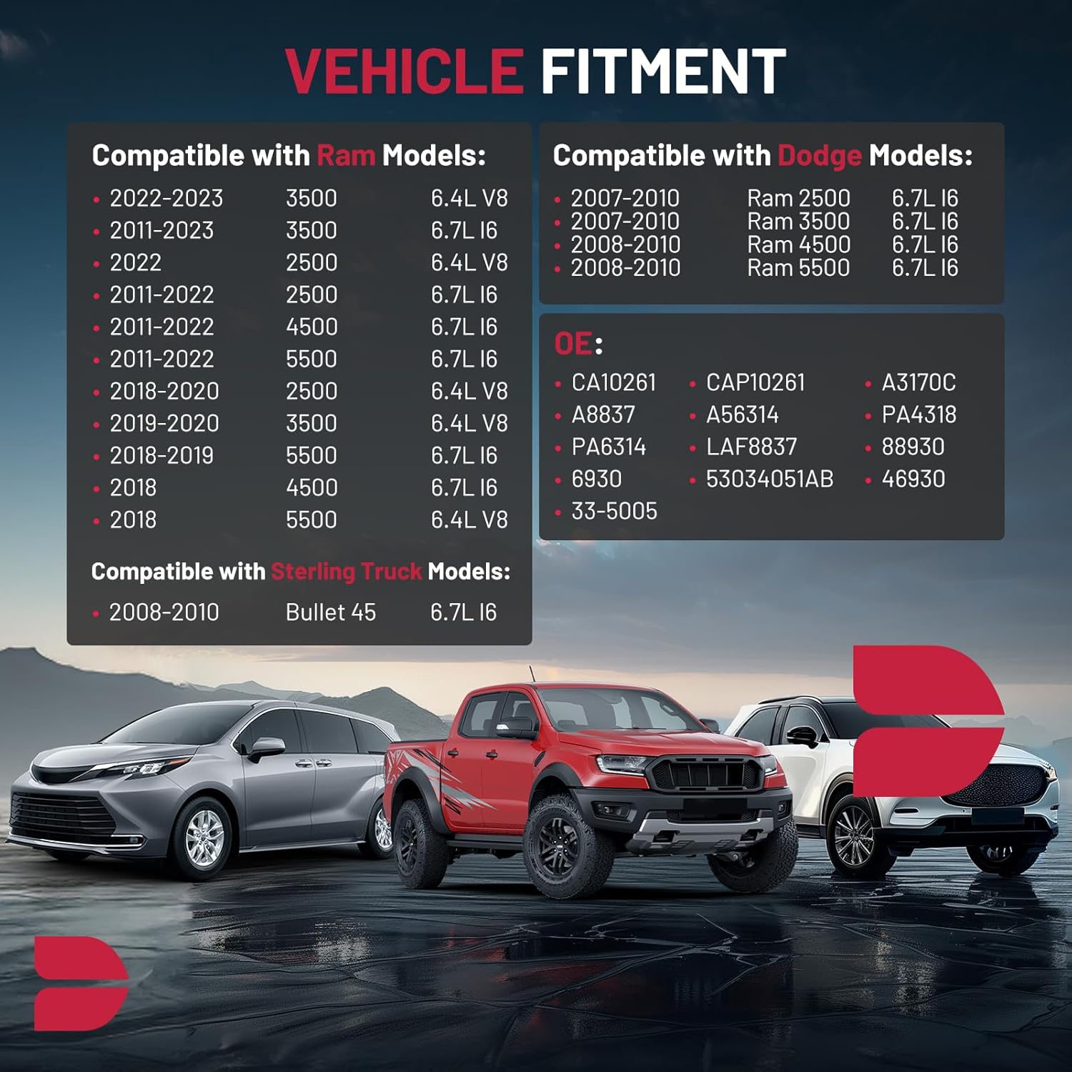 【COMPATIBILITY】Compatible with Ram Models: 2018-2020 & 2022 2500 6.4L V8, 2011-2022 2500/4500/5500 6.7L l6, 2019-2020 & 2022-2023 3500 6.4L V8, 2011-2023 3500 6.7L l6, 2018 5500 6.4L V8; Compatible with Dodge Models: 2007-2010 Ram 2500/Ram 3500 6.7L l6, 2008-2010 Ram 4500/Ram 5500 6.7L l6; Compatible with Sterling Truck Models: 2008-2010 Bullet 45 6.7L l6