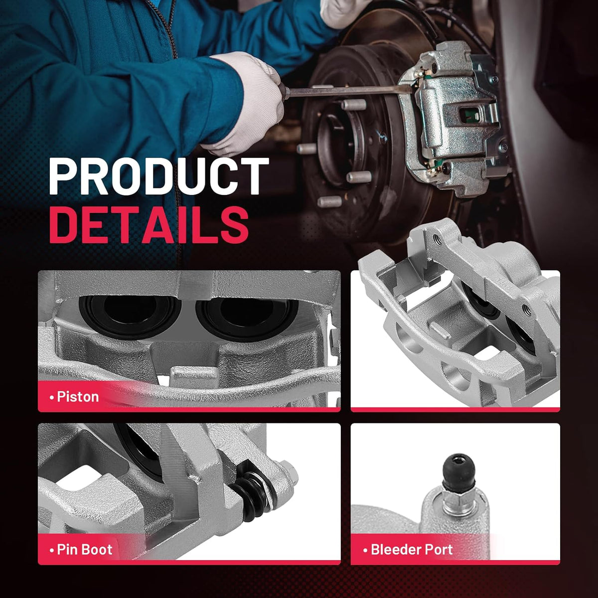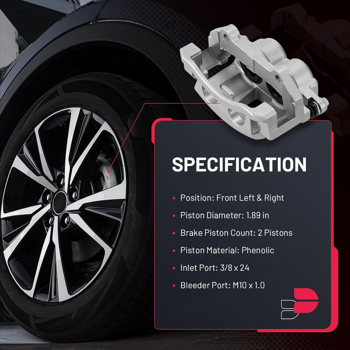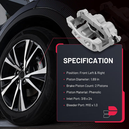 【Specification】① Position: Front Left & Right ② Piston Diameter: 1.89 in ③ Brake Piston Count: 2 Pistons ④ Piston Material: Phenolic ⑤ Inlet Port: 3/8 x 24 ⑥ Bleeder Port: M10 x 1.0