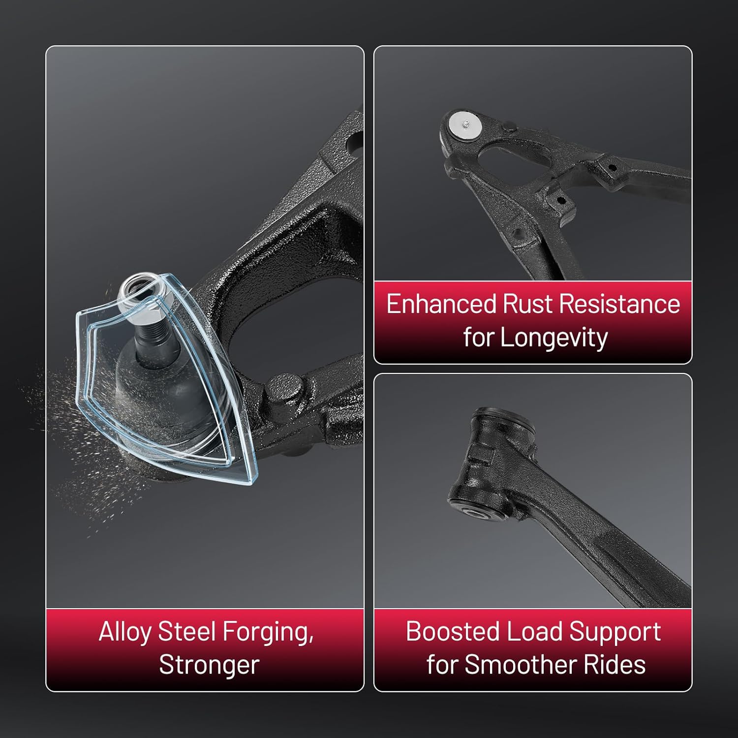 【Control Arm Features】 The control arm improves stability, handling, and driving comfort, with a protective finish that helps extend service life. Made from forged alloy steel, it delivers reliable performance, reduces noise, and ensures accurate fitment for safe and consistent driving