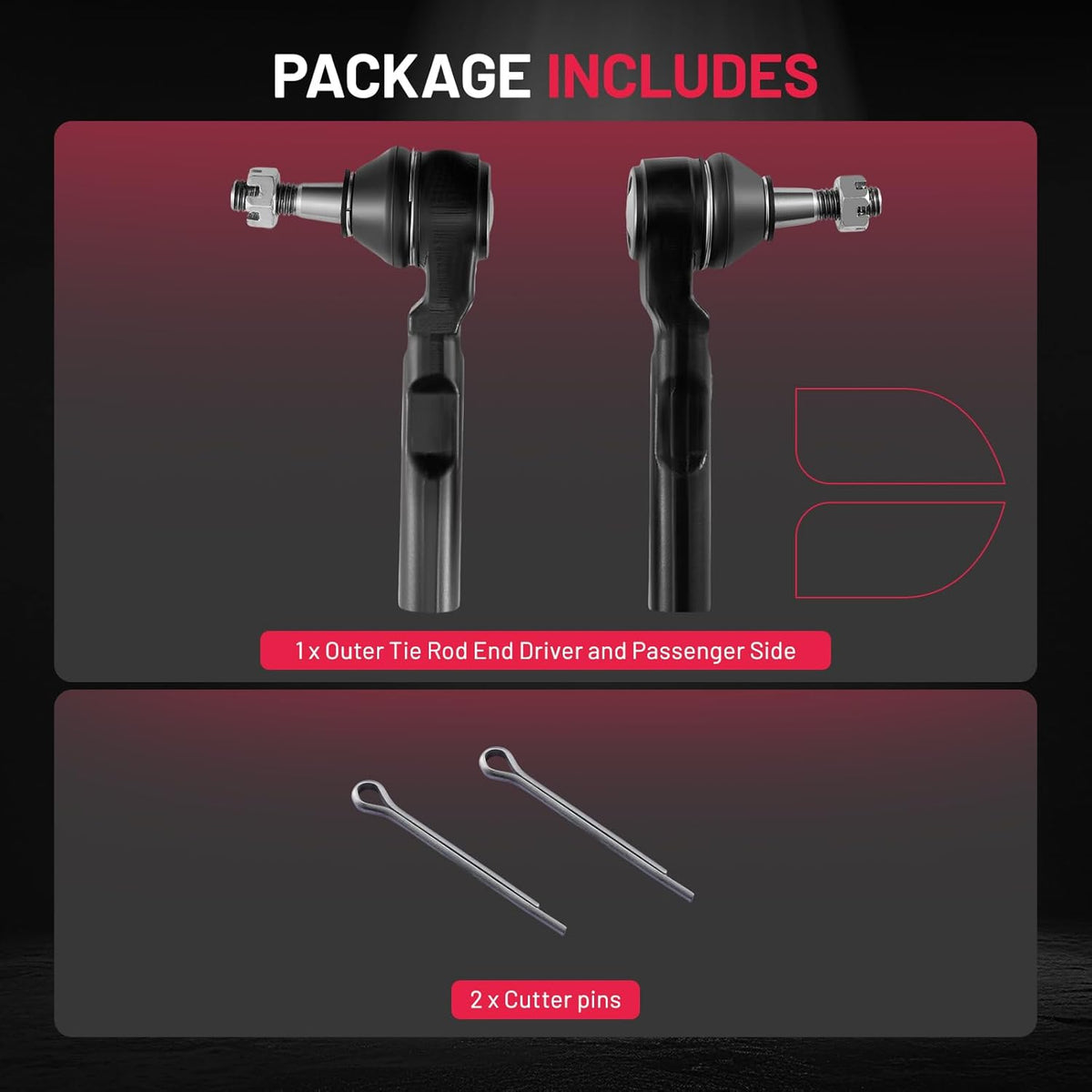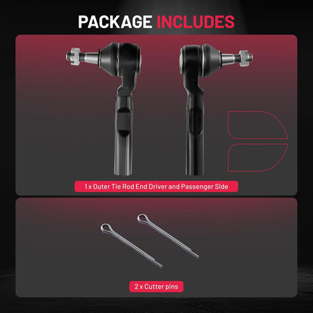 Tie Rod Ends Kit Include:1 x ES800086 Front Outer Tie Rod End Driver and Passenger Side, 2 x Cutter pins.