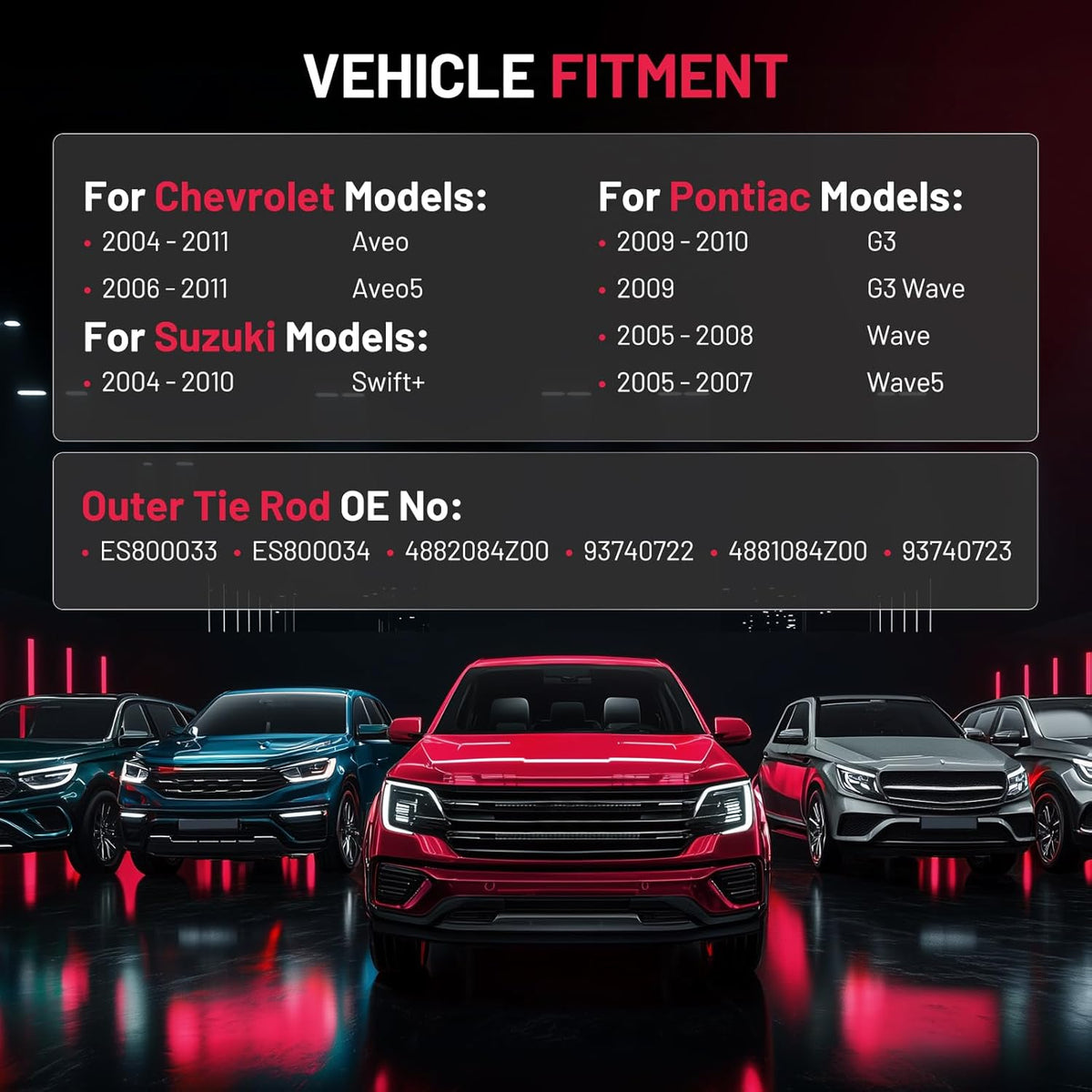 Compatible with Chevrolet 2004-2011 Aveo, 2006-2011 Aveo5; Compatible with Pontiac 2009-2010 G3, 2009 G3 Wave, 2005-2008 Wave, 2005-2007 Wave5; Compatible with Suzuki 2004-2010 Swift.etc.More information can be found in the pictures or on the details page.Please confirm compatibility based on your vehicle's year, brand, model, and the OE number of the replacement parts.