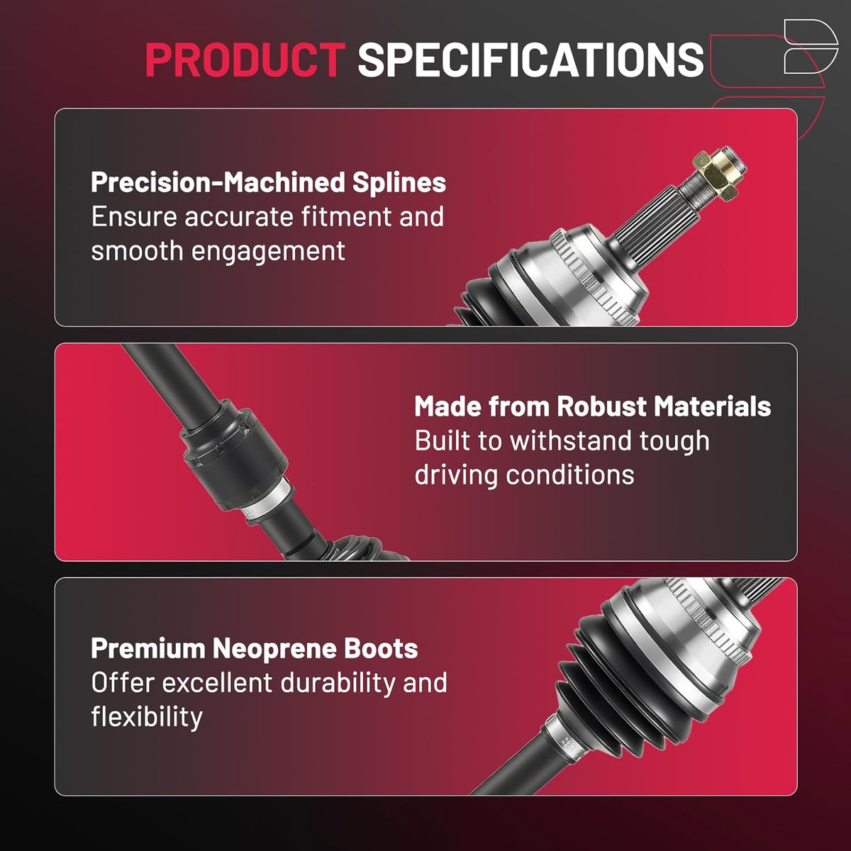 【Product Advantages】 Engineered for peak performance, our premium neoprene boots shield your CV joints from dirt and debris, while moly grease ensures smooth operation even under extreme temperatures. Secured with heavy-duty stainless-steel clamps, this durable, maintenance-free assembly delivers long-lasting reliability you can trust.