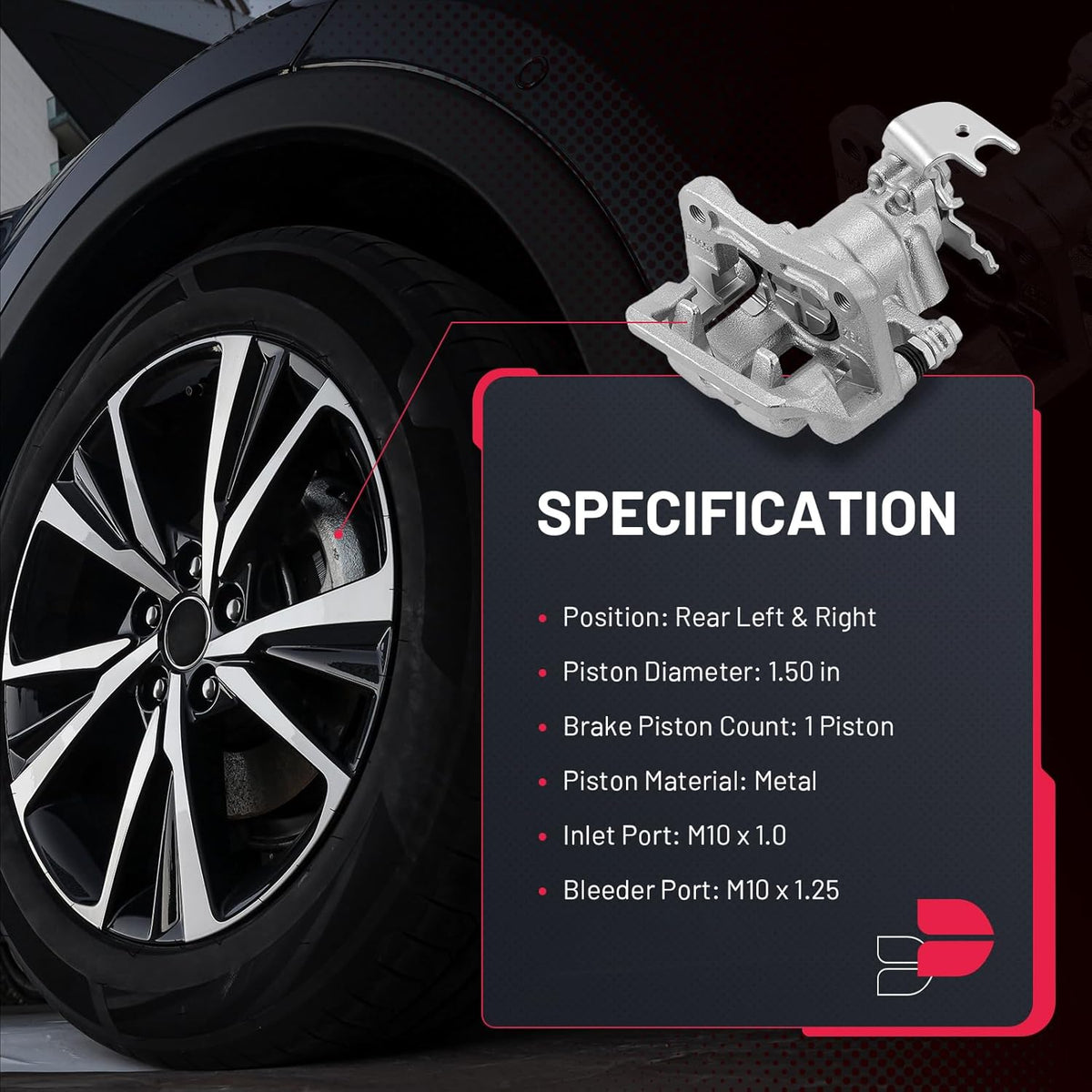 【Specification】① Position: Rear Left & Right ② Piston Diameter: 1.50 in ③ Brake Piston Count: 1 Piston ④ Piston Material: Metal ⑤ Inlet Port: M10 x 1.0 ⑥ Bleeder Port: M10 x 1.25