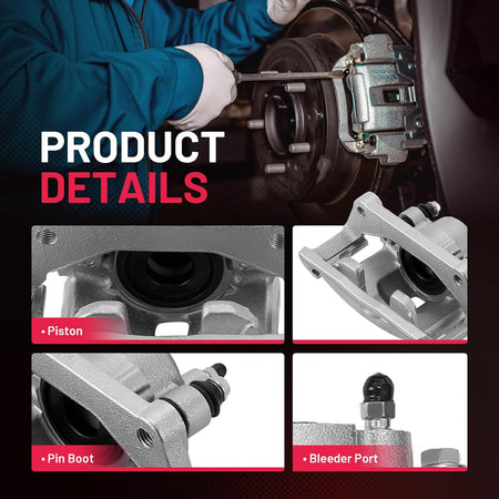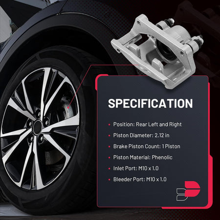 【Specification】① Position: Rear Left and Right ② Piston Diameter: 2.12 in ③ Brake Piston Count: 1 Piston ④ Piston Material: Phenolic ⑤ Inlet Port: M10 x 1.0 ⑥ Bleeder Port: M10 x 1.0