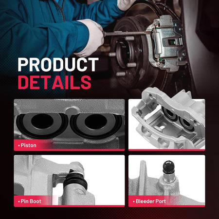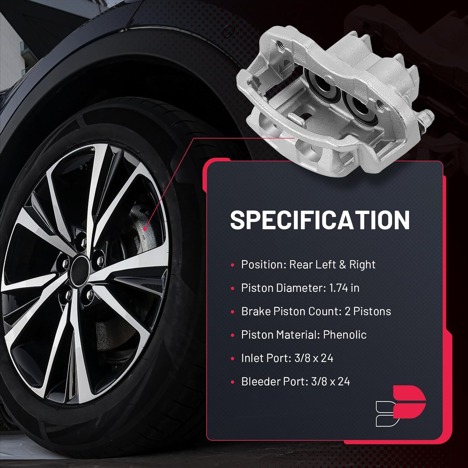 【Specification】① Position: Rear Left & Right ② Piston Diameter: 1.74 in ③ Brake Piston Count: 2 Pistons ④ Piston Material: Phenolic ⑤ Inlet Port: 3/8 x 24 ⑥ Bleeder Port: 3/8 x 24
