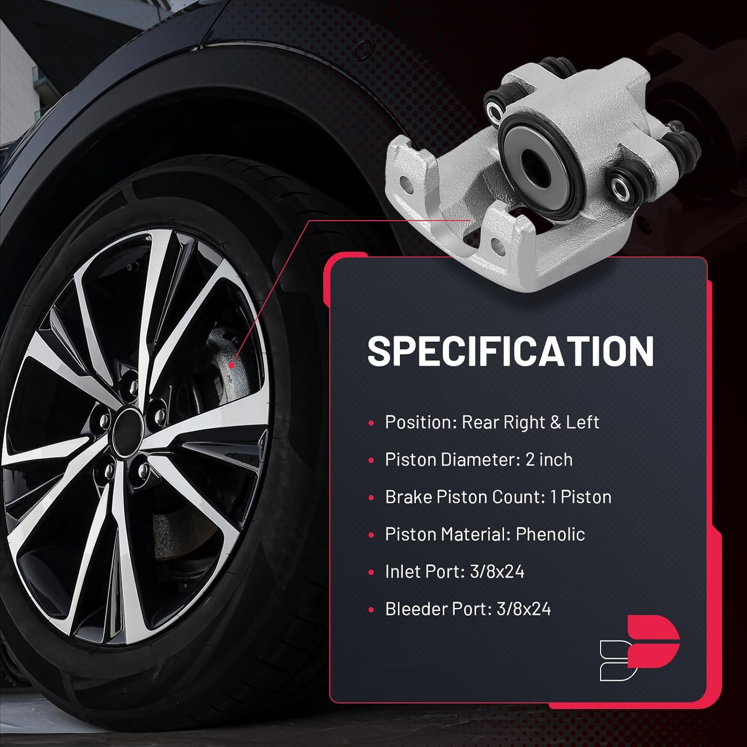 【Specification】① Position: Rear Right & Left ② Piston Diameter: 2 inch ③ Brake Piston Count: 1 Piston ④ Piston Material: Phenolic ⑤ Inlet Port: 3/8x24 ⑥ Bleeder Port: 3/8x24⑦ Mounting Hardware: Yes